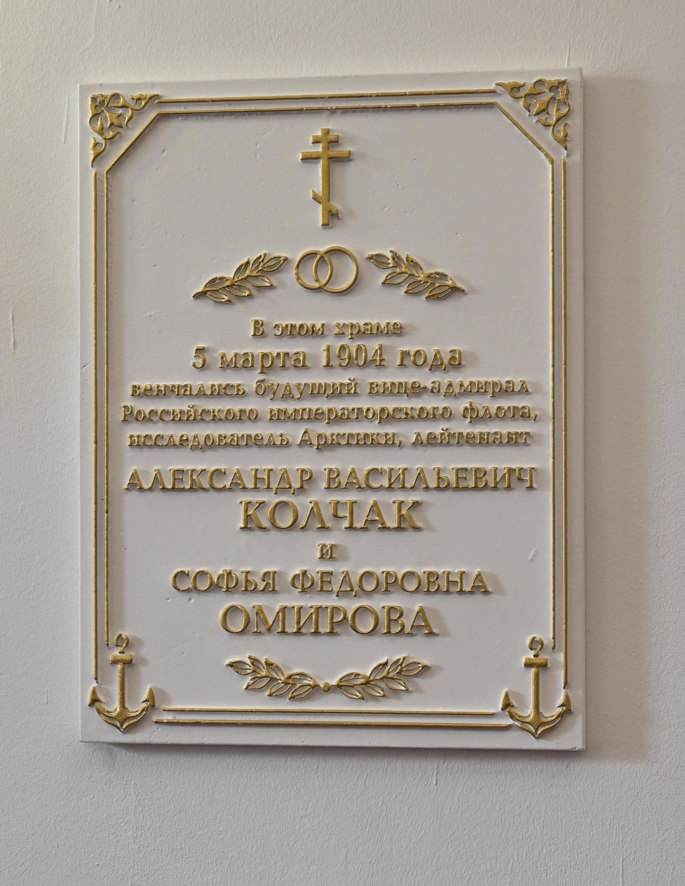 По окончании Божественной литургии состоялось торжественное открытие мемориальной таблички, посвященной историческому факту венчания в храме адмирала Колчака. Мемориальная табличка появилась в храме по инициативе генерал-лейтенанта полиции Дмитрия Анатольевича Ильичева.