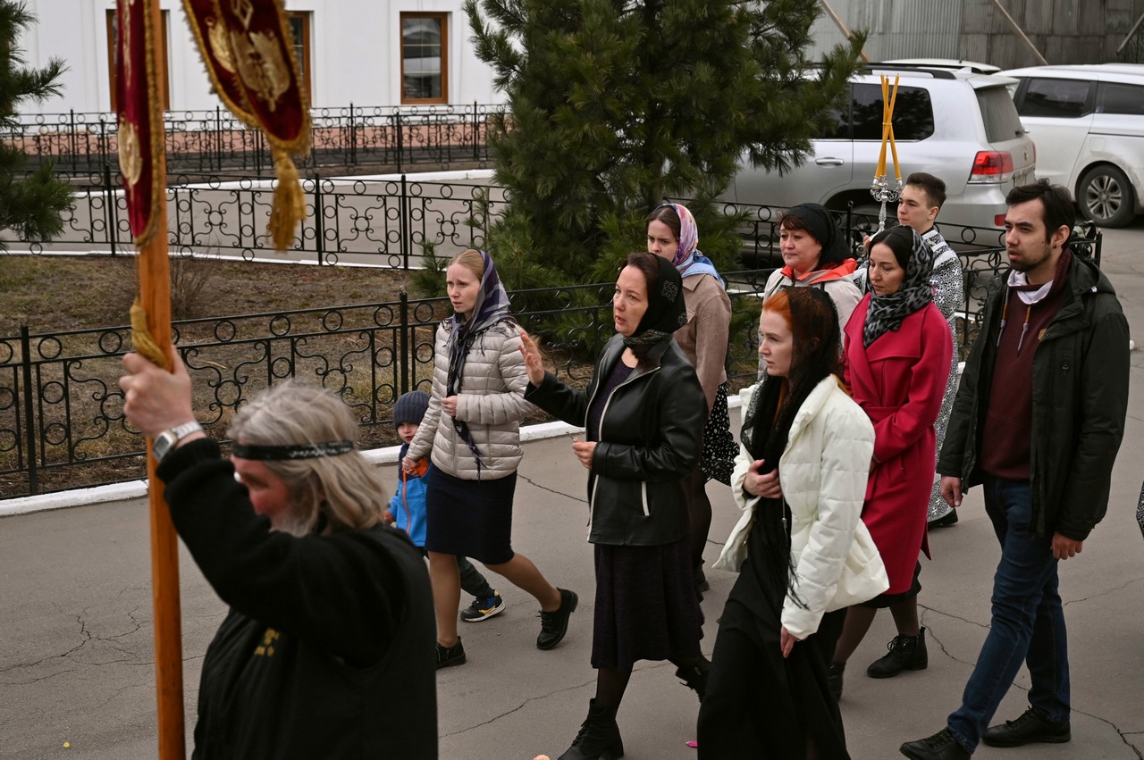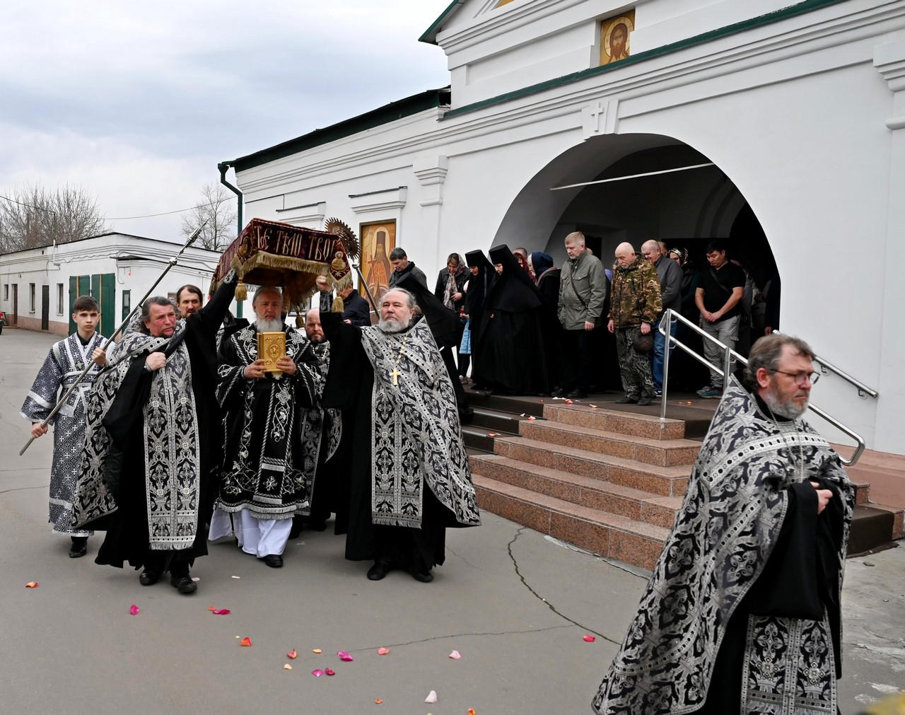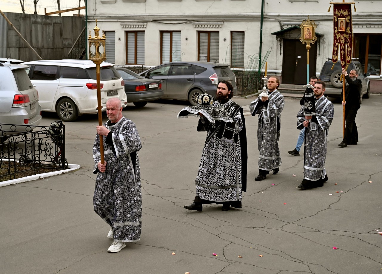 После великого славословия с пением погребального «Святый Боже» вокруг храма был совершен крестный ход с Плащаницей.