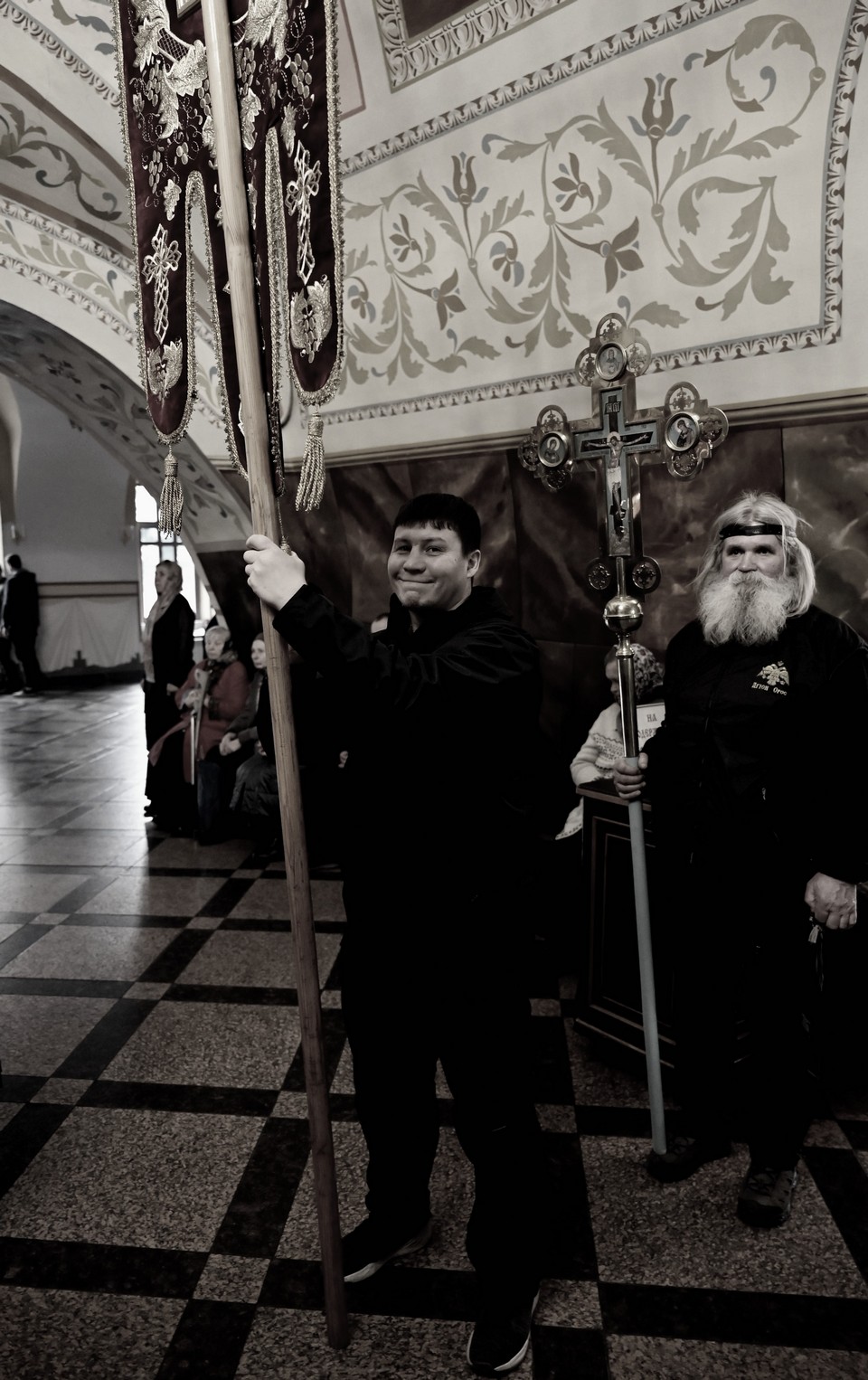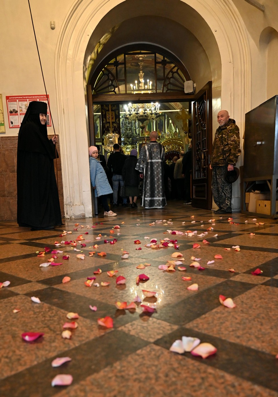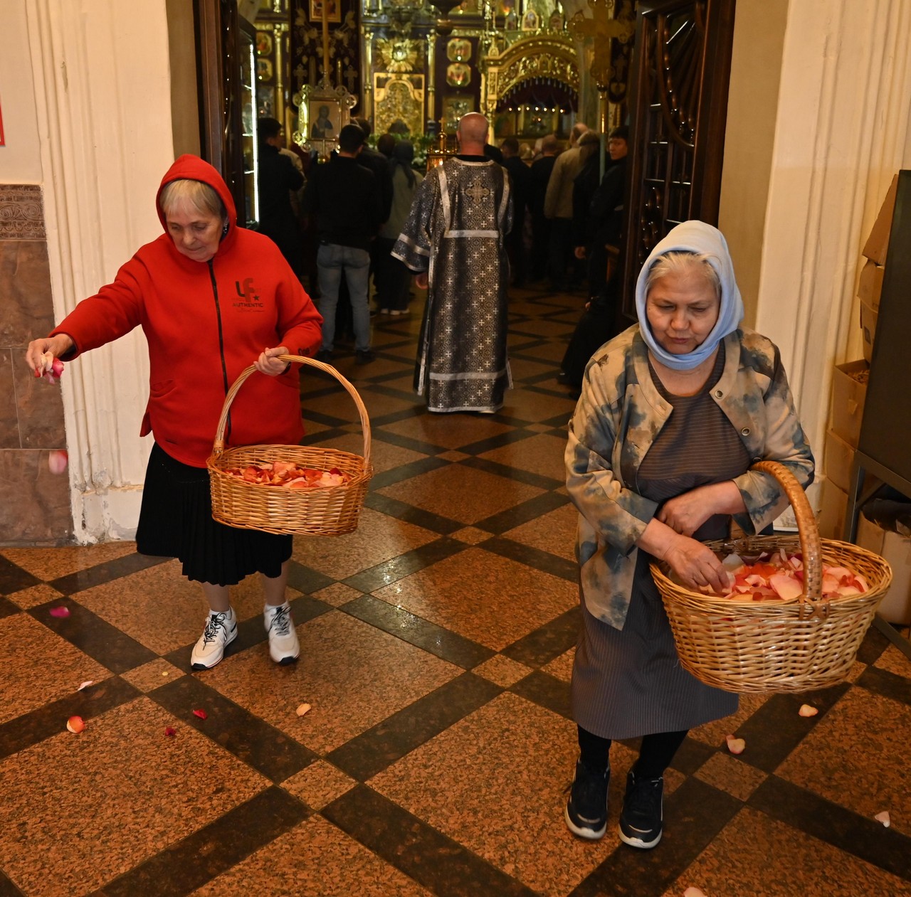 После великого славословия с пением погребального «Святый Боже» вокруг храма был совершен крестный ход с Плащаницей.