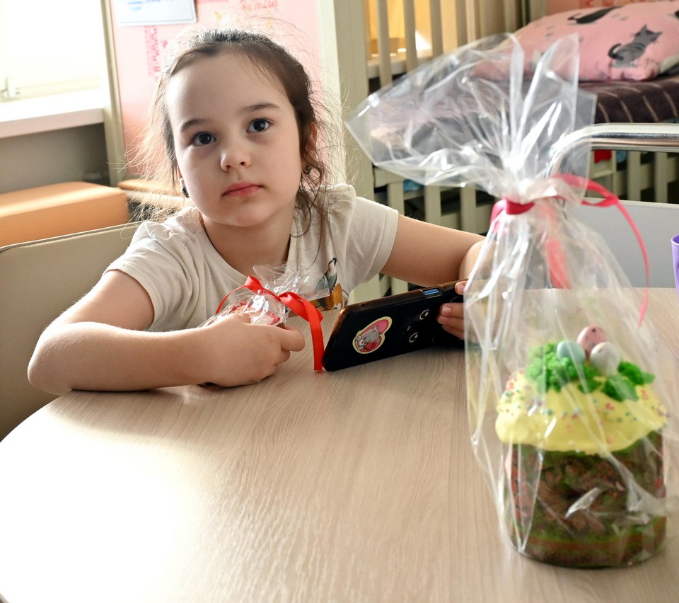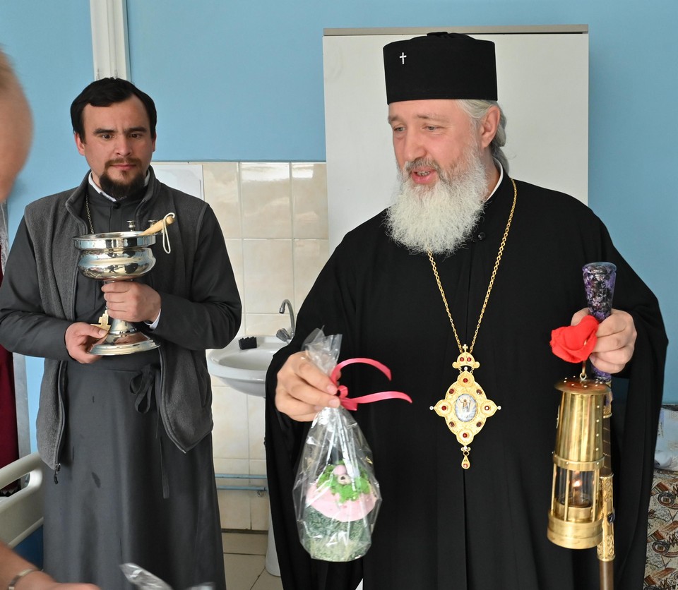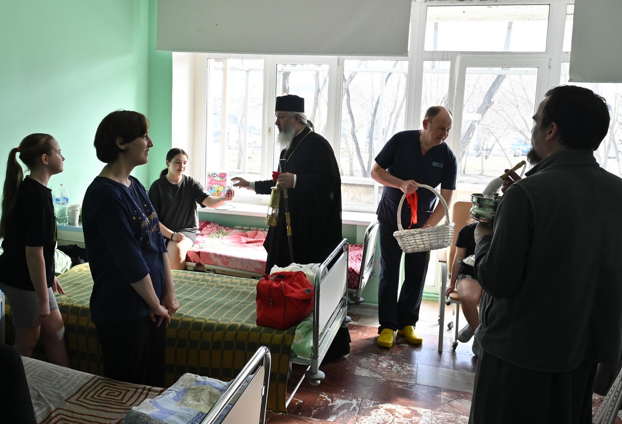 С пением Пасхального тропаря Владыка посетил каждую палату, благословляя детей и молясь о них, а также дарил им и персоналу больницы Пасхальные куличи, яйца, пасхи и пряники и окроплял святой водой, освященной на Божественной литургии в день иконы Божией Матери «Живоносный Источник».