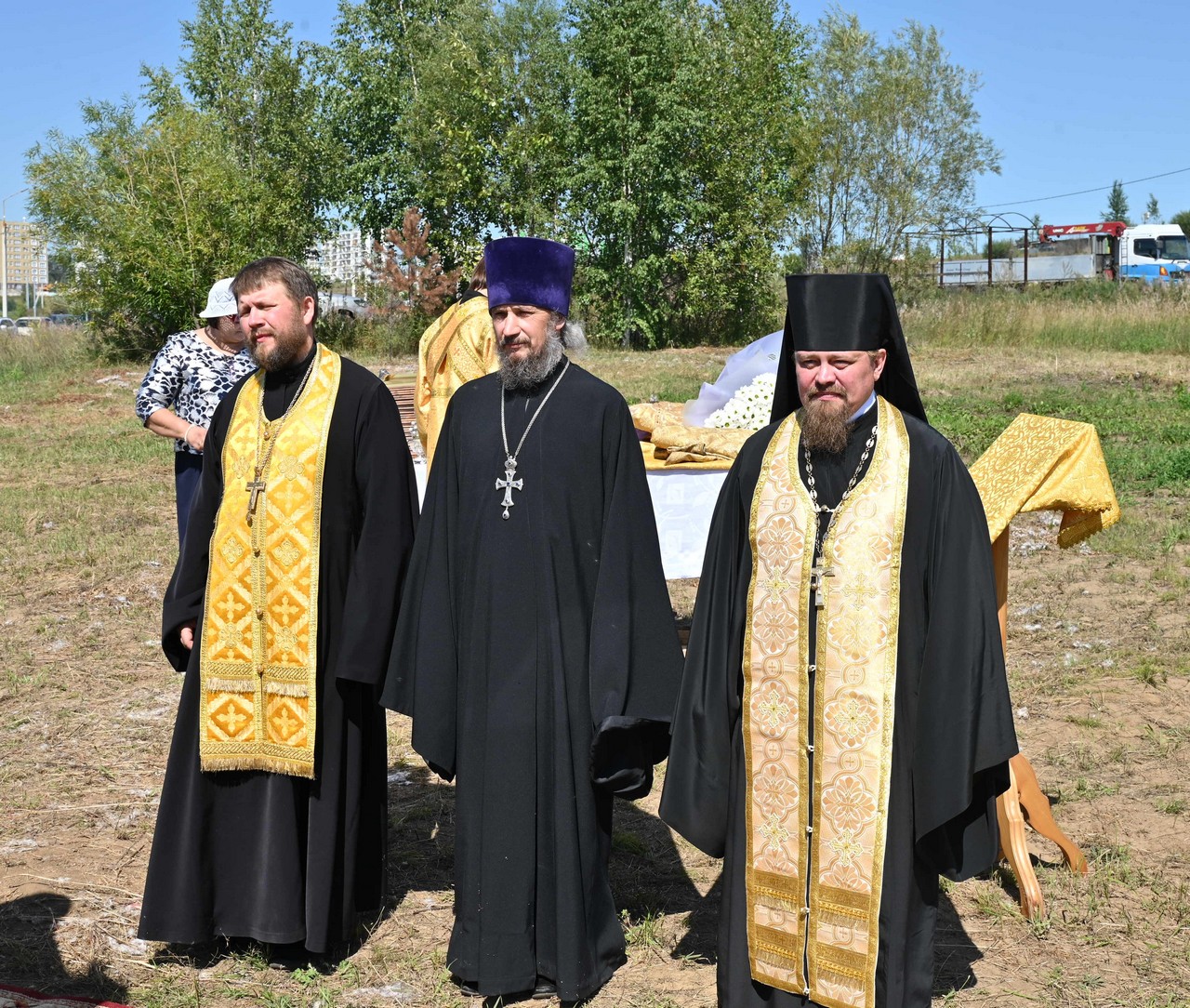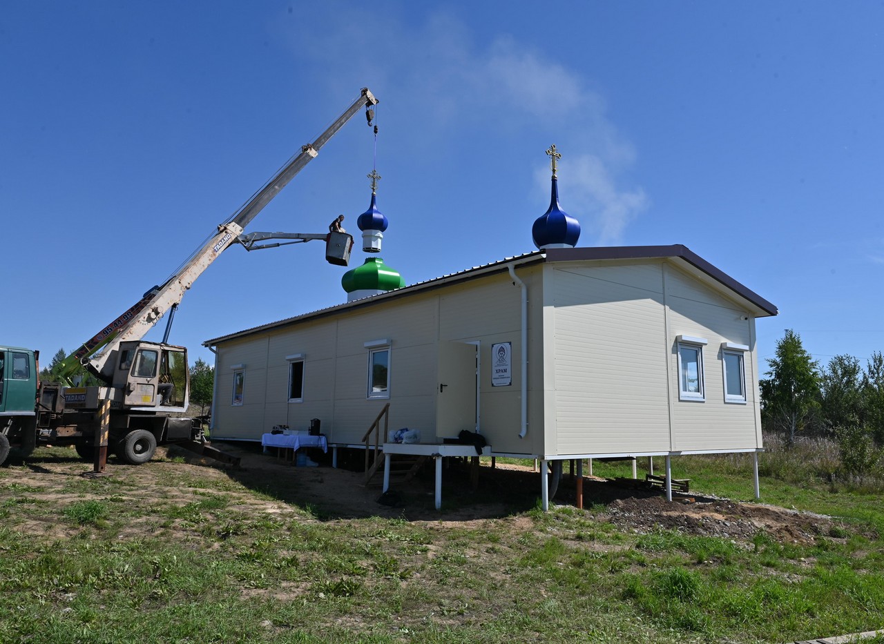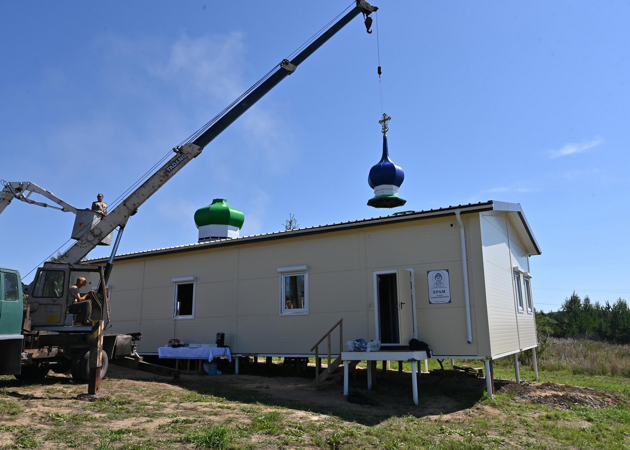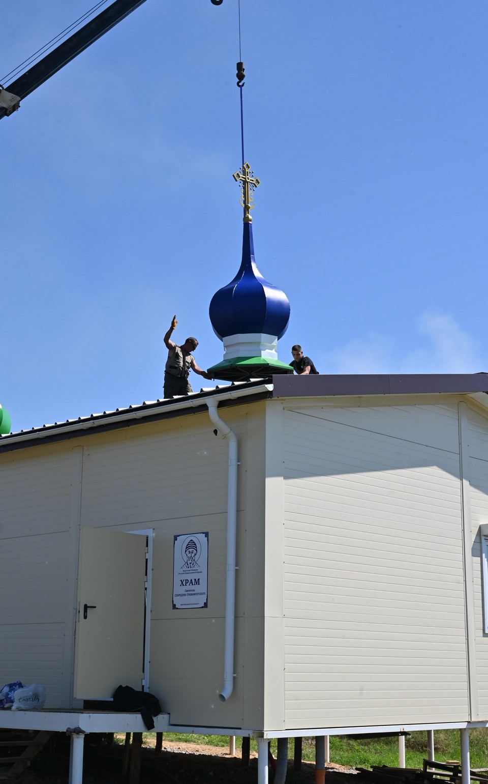 По окончании торжественной части два купола с крестами были подняты и установлены на крыше временного здания храма, первые богослужения в котором планируется начать уже в сентябре.