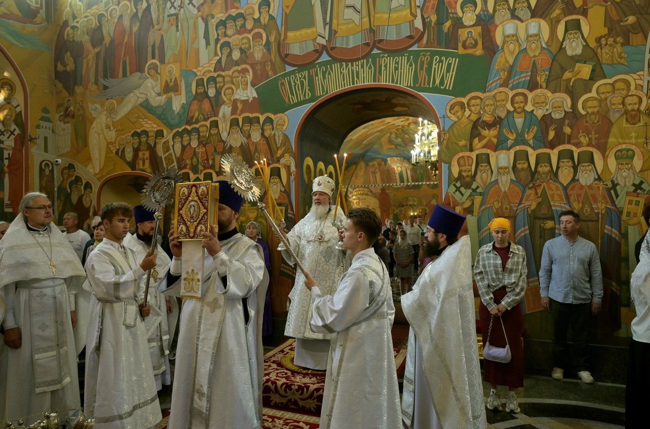 Воскресную Божественную литургию в Неделю 11-ю по Пятидесятнице, 24 августа 2025 года, Попразднство Преображения Господня, митрополит Иркутский и Ангарский Максимилиан совершил в кафедральном соборе Богоявления Господня г.Иркутска в сослужении братии храма.