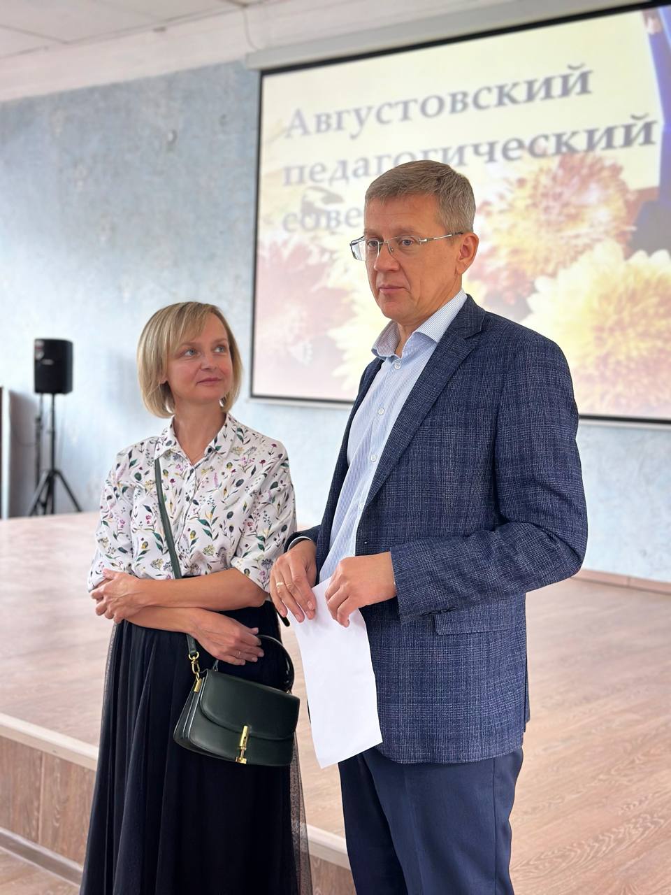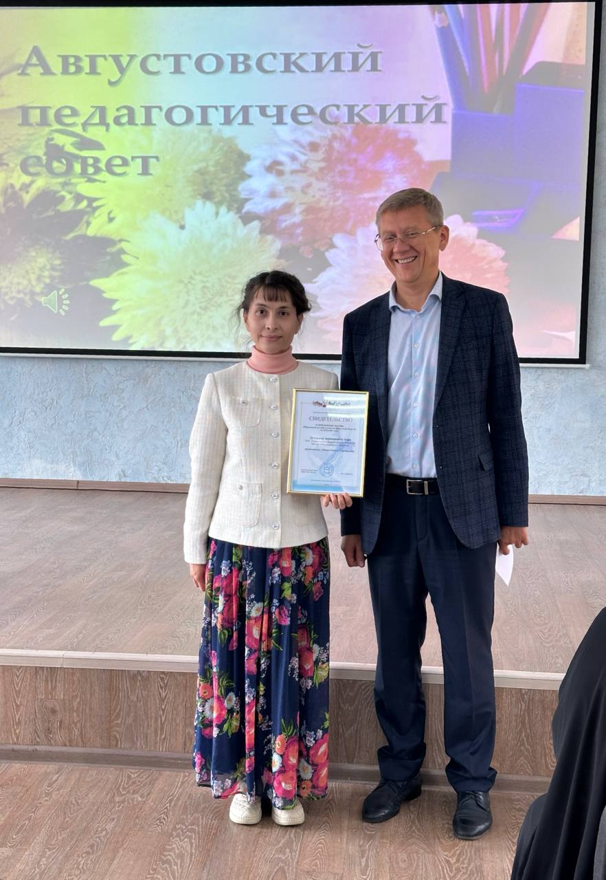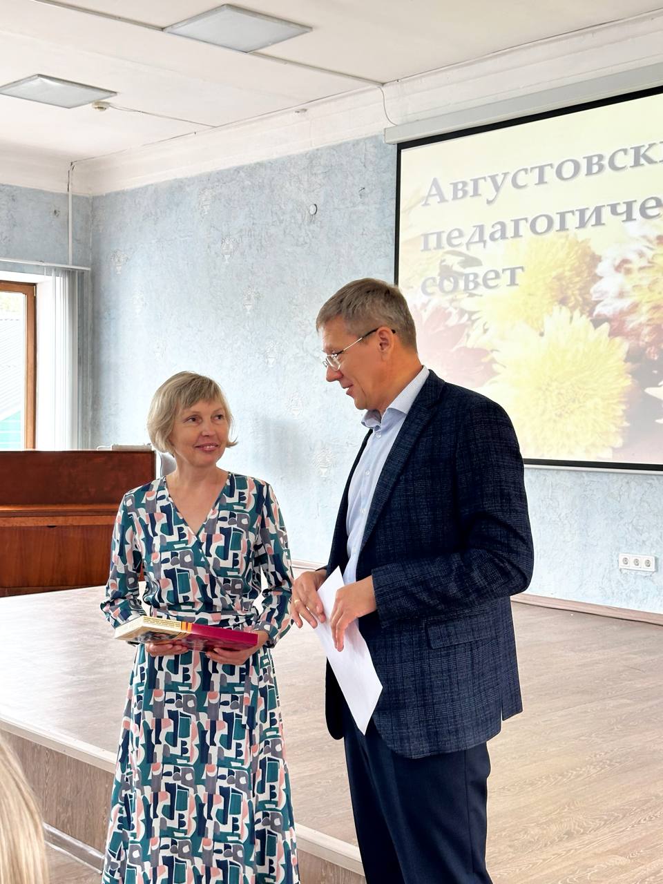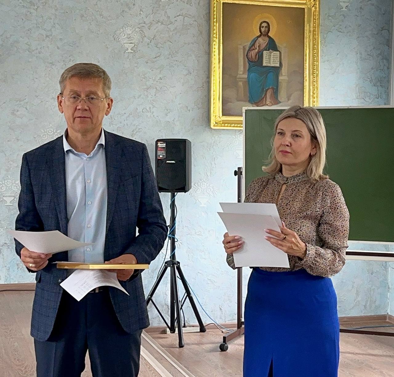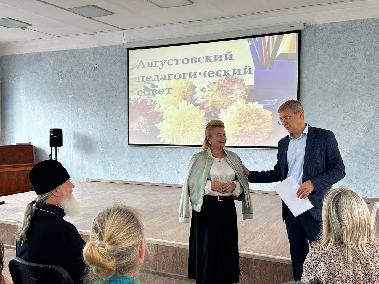 Директор гимназии Вячеслав Иванович Четвертаков вручил педагогам грамоты за добросовестный труд и участие в конкурсах и олимпиадах, а также поздравил летних именинников, в том числе и владыку Максимилиана, и представил преподавателям новых коллег, который вливаются в педагогический коллектив в наступающем учебном году.