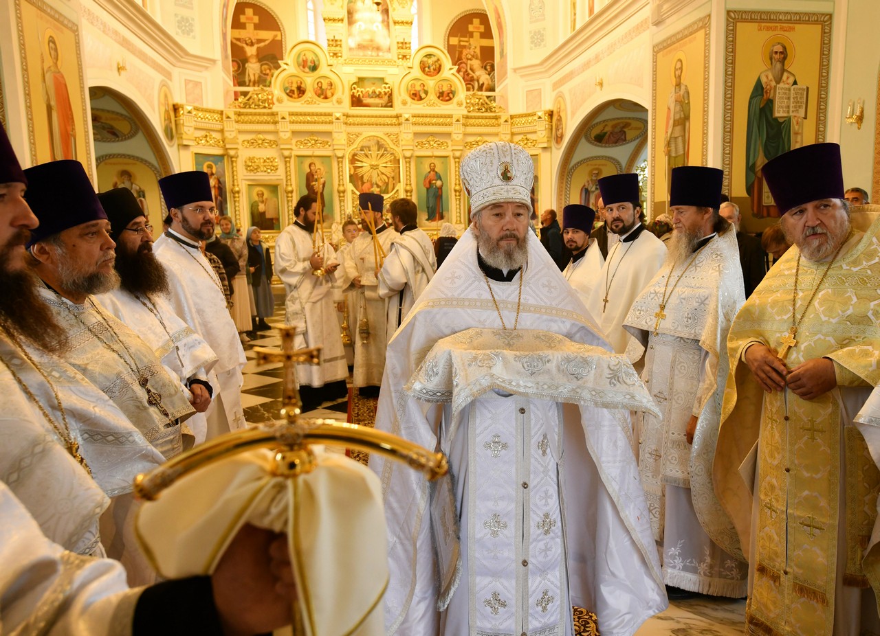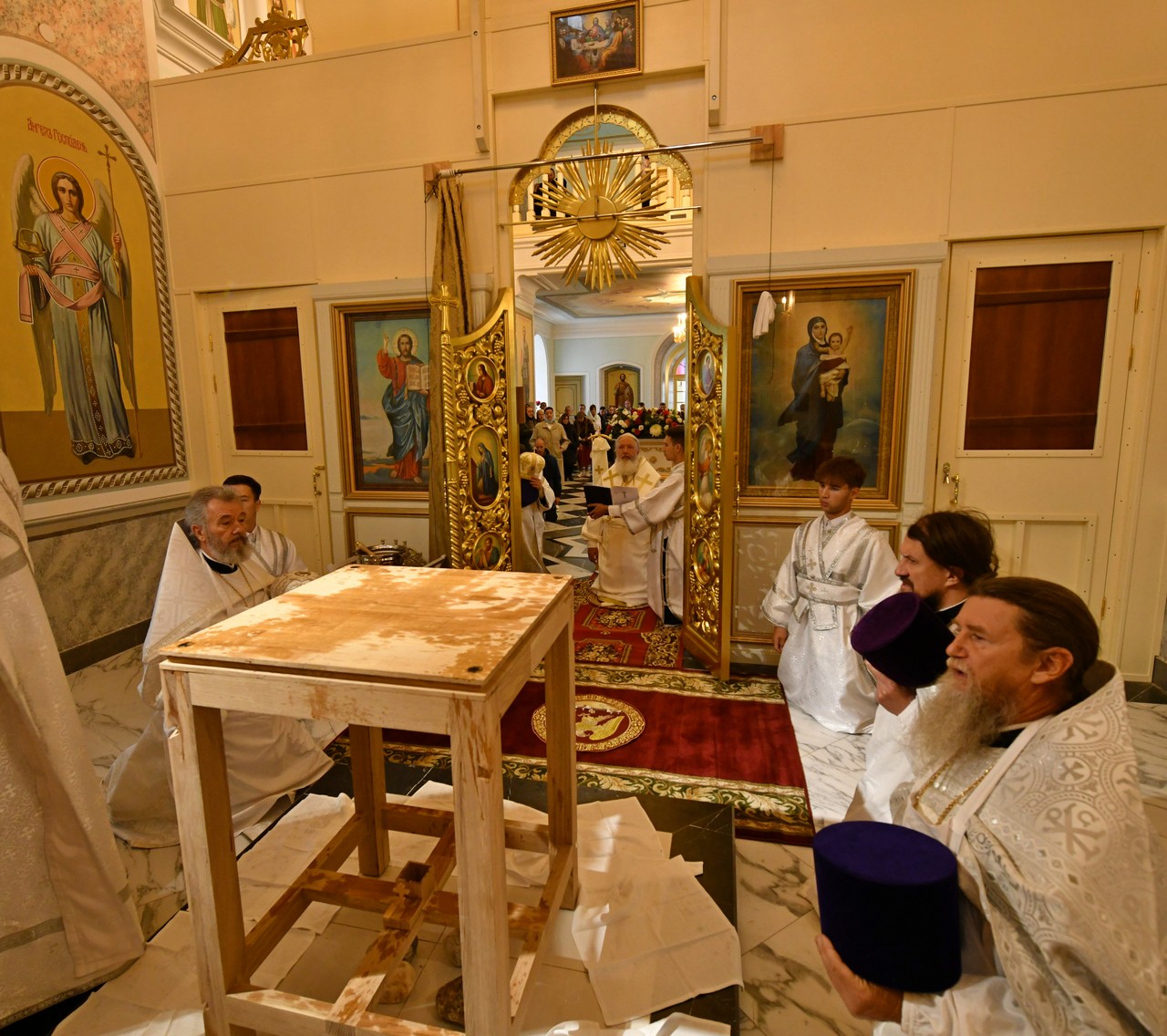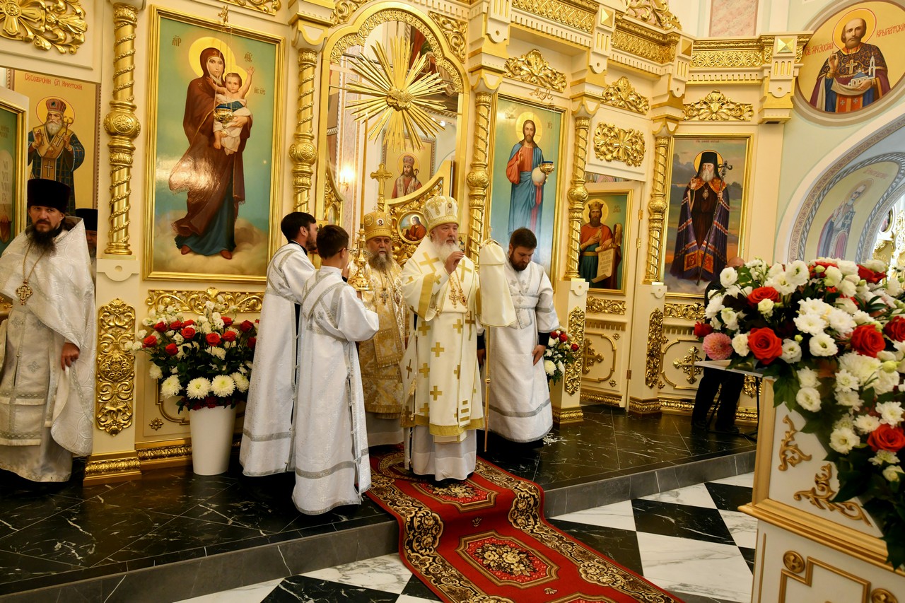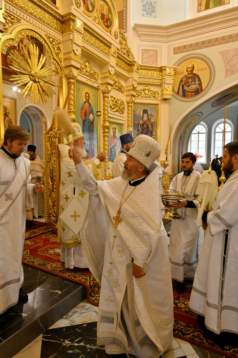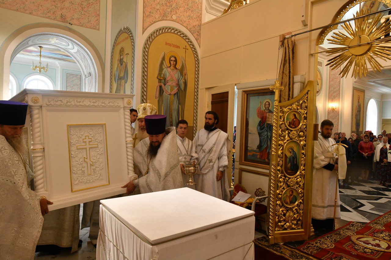 В соборе три придела: главный во имя Воскресения Христова, правый в честь Казанской иконы Божией Матери и левый в честь святителей Николая, Тихона Задонского и Григория Богослова. Казанский придел был освящен в июле, а сегодня освятили главный Воскресенский придел и придел трех святителей.