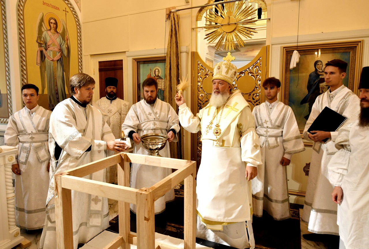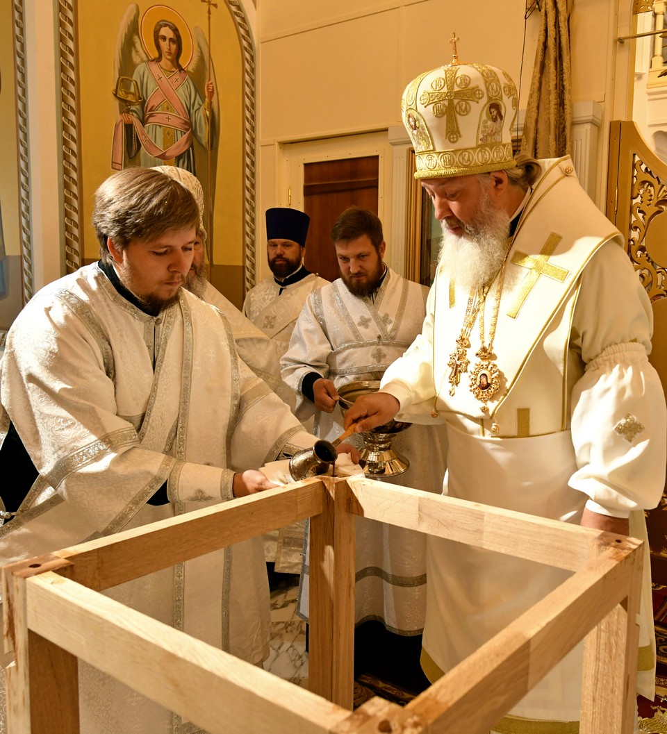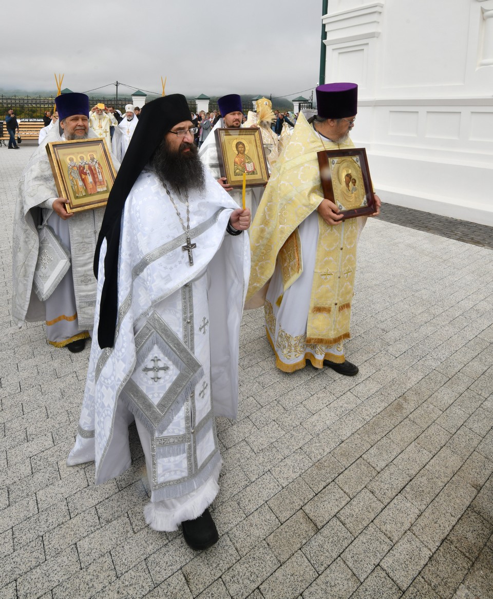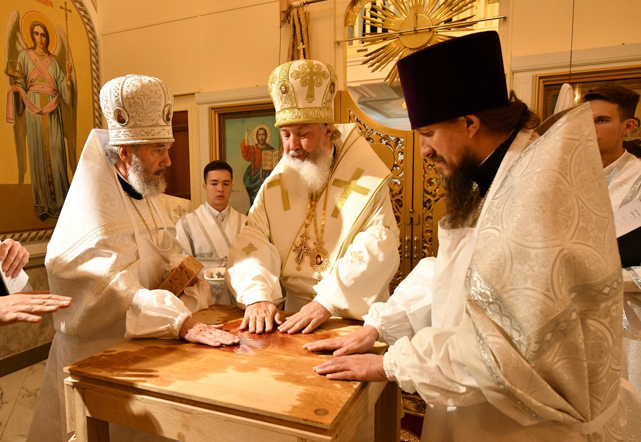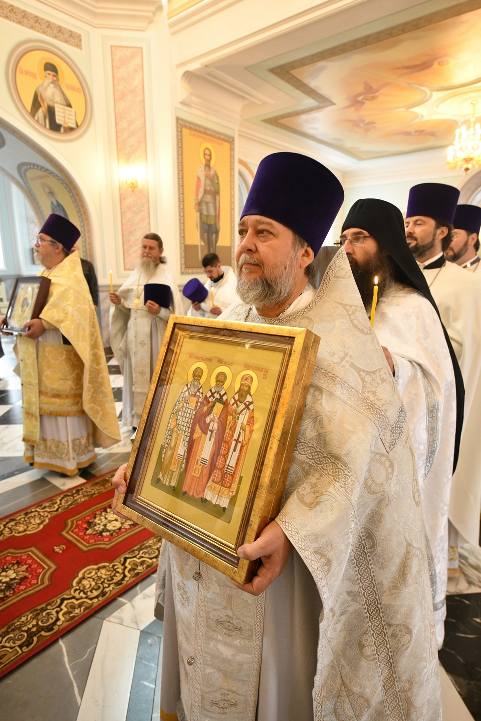 В соборе три придела: главный во имя Воскресения Христова, правый в честь Казанской иконы Божией Матери и левый в честь святителей Николая, Тихона Задонского и Григория Богослова. Казанский придел был освящен в июле, а сегодня освятили главный Воскресенский придел и придел трех святителей.