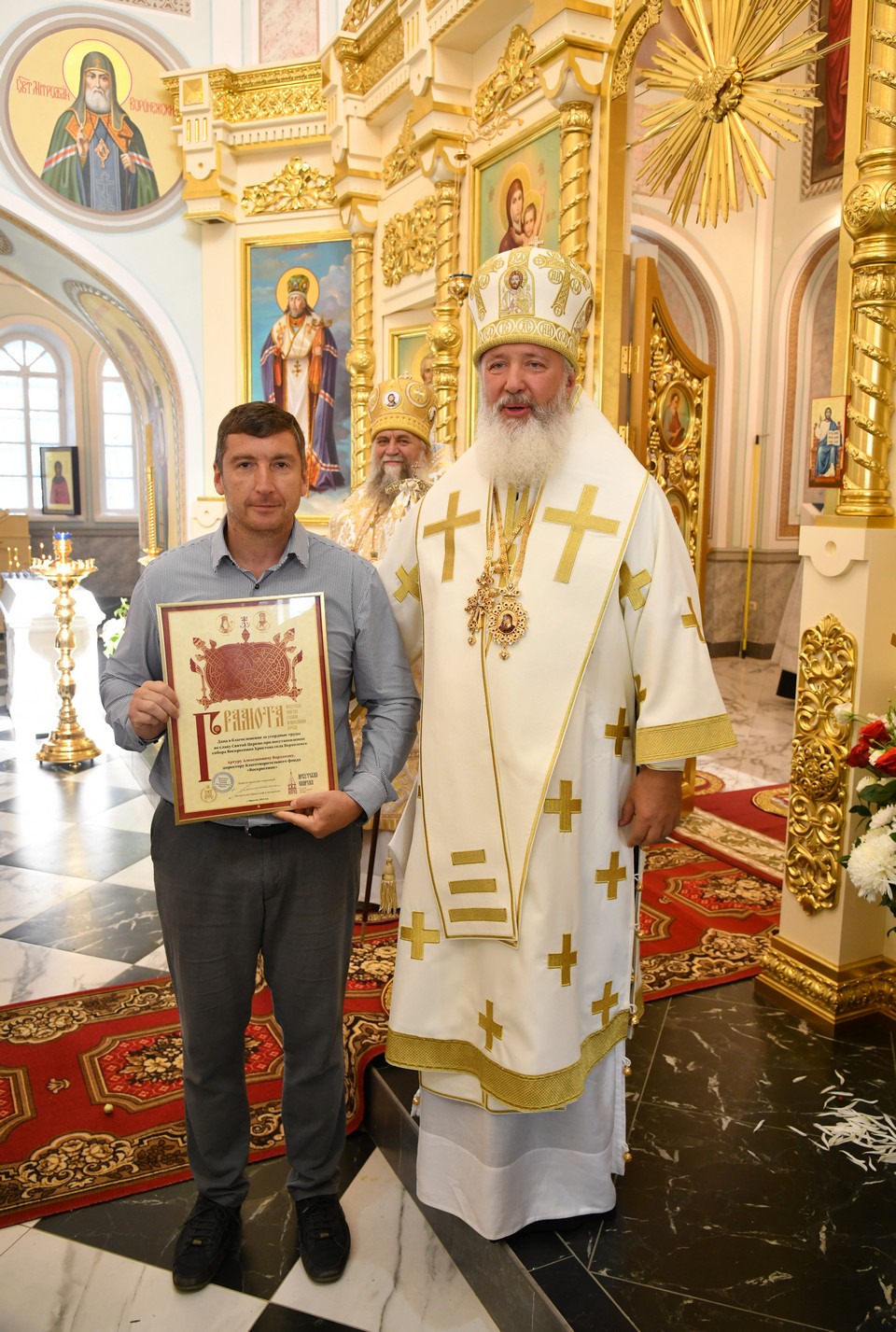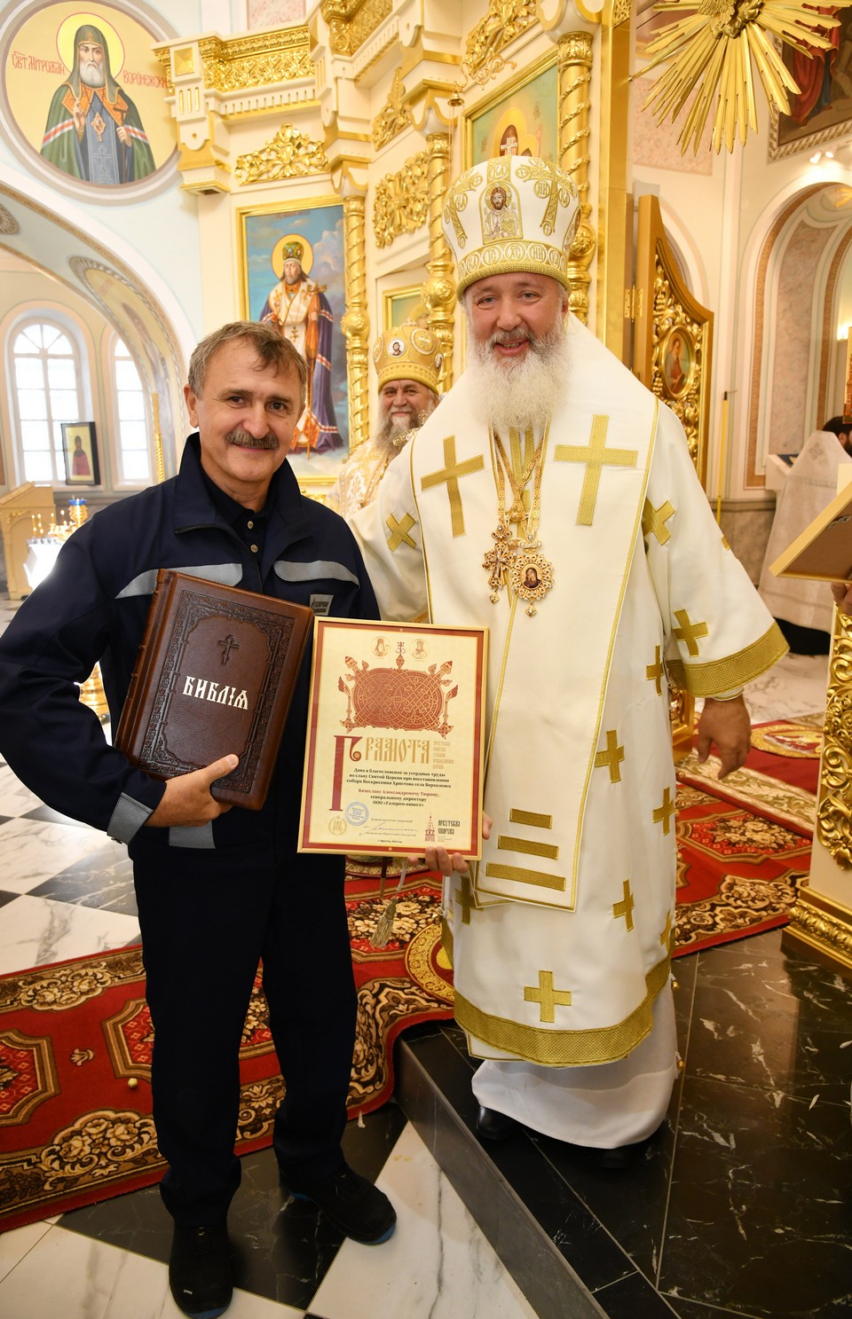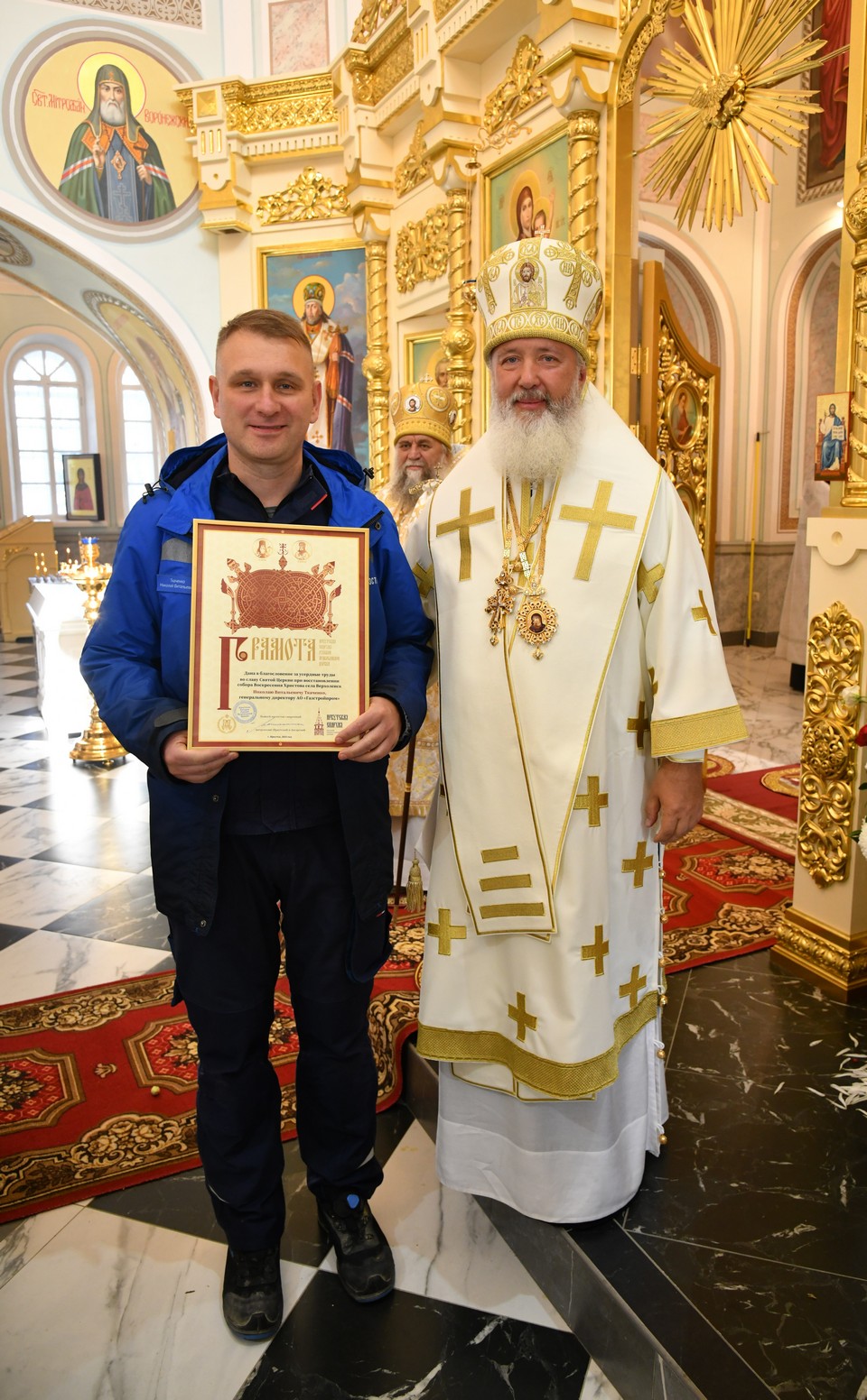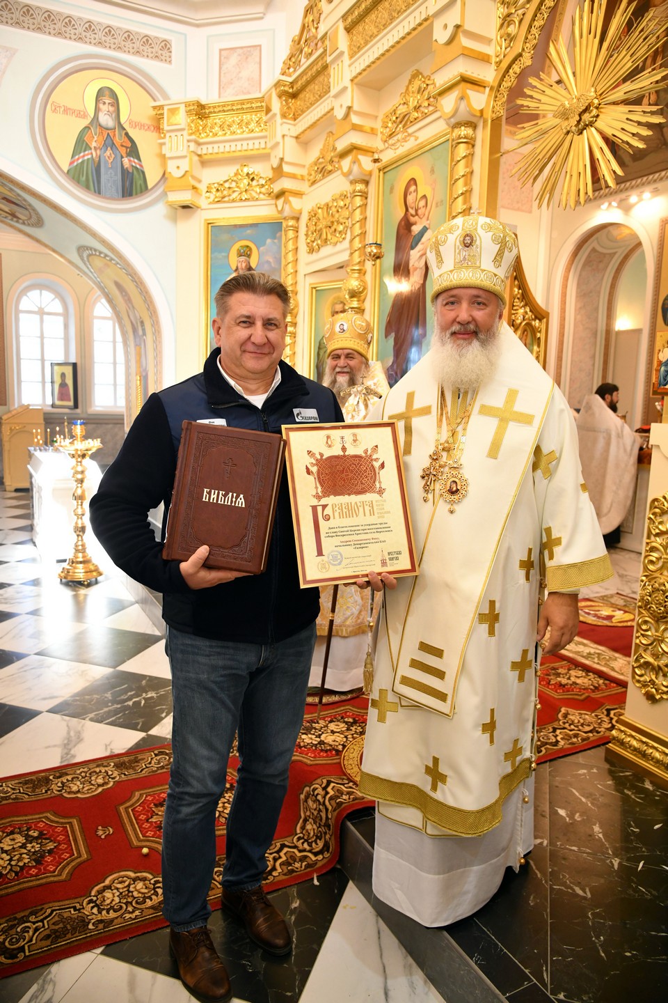 По завершении богослужения митрополит Максимилиан вручил в благодарность за труды по восстановлению собора во Славу Божию Благословенные архиерейские грамоты руководителям «Газпрома» и меценатам: