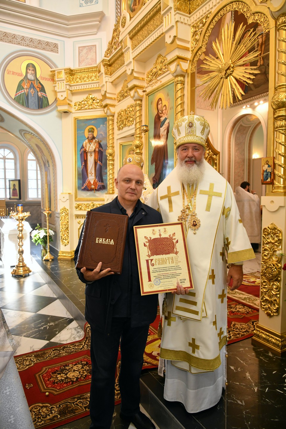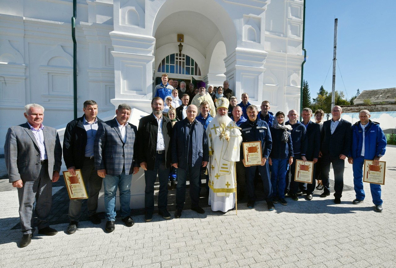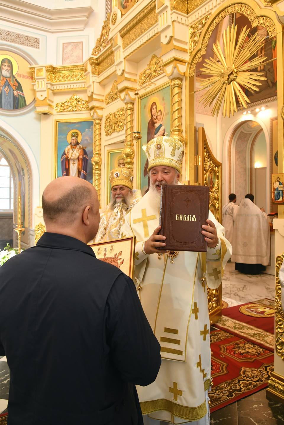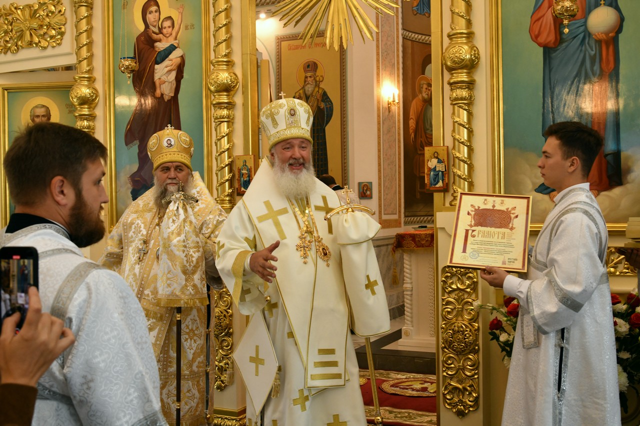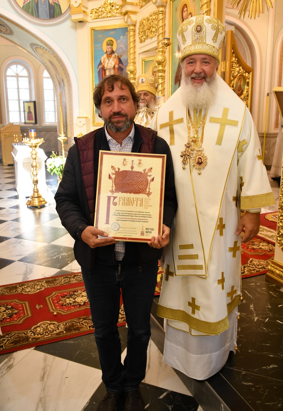 По завершении богослужения митрополит Максимилиан вручил в благодарность за труды по восстановлению собора во Славу Божию Благословенные архиерейские грамоты руководителям «Газпрома» и меценатам: