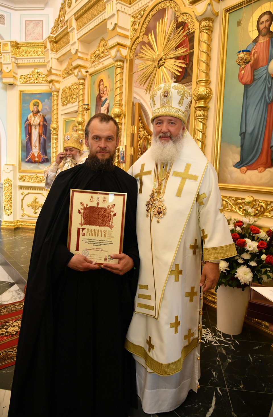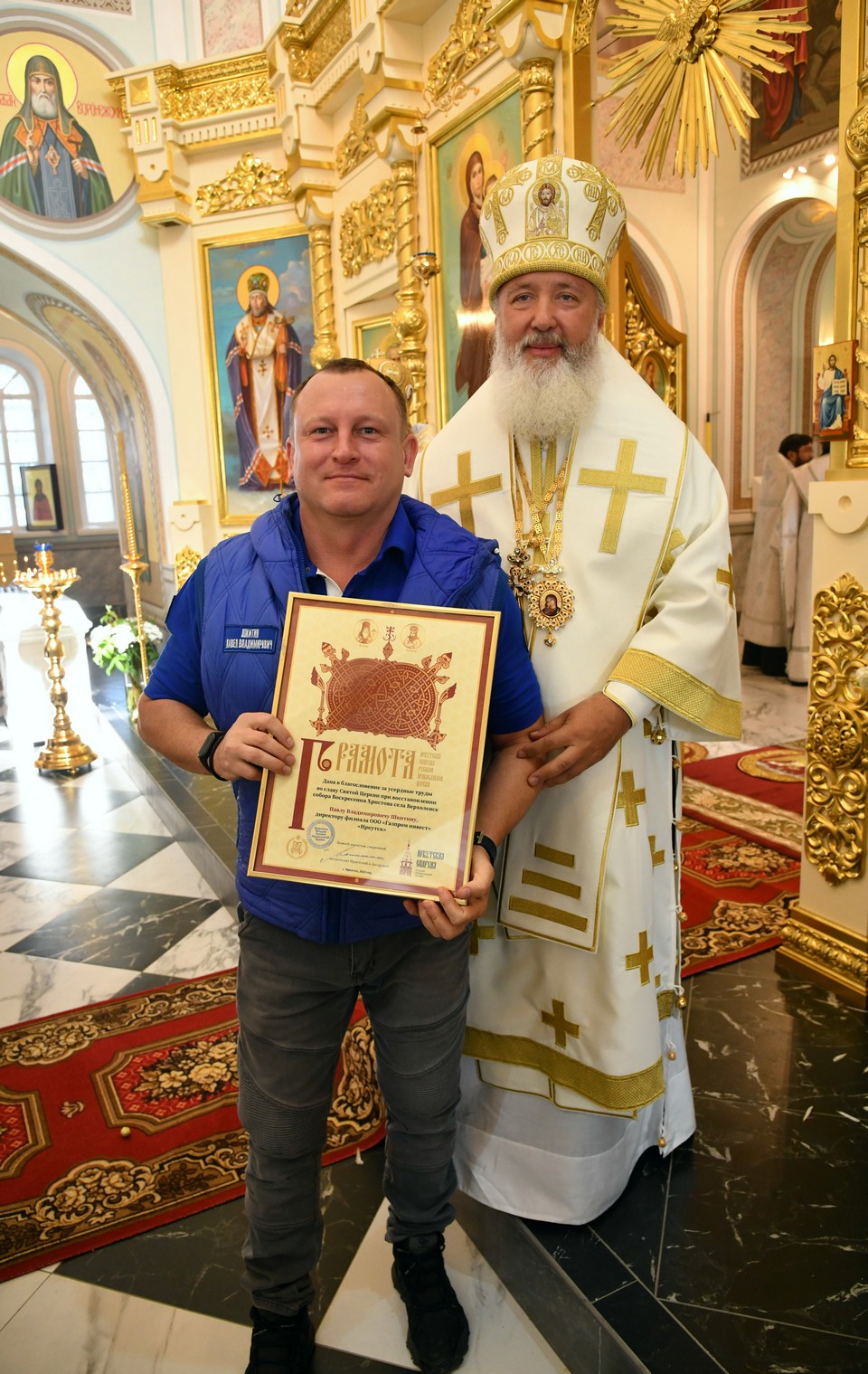 Также в этот день по благословению Святейшего Патриарха Московского и всея Руси Кирилла Патриаршим знаком «Храмостроитель» был награжден Игорь Пинайкин, учредитель и сотрудник ООО СИБНИПИ «Наследие», который в течение 30 лет занимается реставрацией старинных храмов Иркутской митрополии, в том числе и Верхоленского собора, а настоятель собора архимандрит Никодим (Комарницкий) по благословению Святейшего Патриарха Кирилла был удостоен ордена преподобного Серафима Саровского.