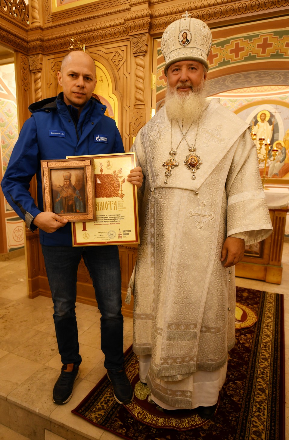 Во внимание к трудам во Славу Святой Церкви - строительство храмов в Верхоленске и Нючакане - по благословению Патриарха Московского и всея Руси Кирилла, митрополит Максимилиан вручил Орден прп.Серафима Саровского lll-й степени Павлу Владимировичу Шкитину, директору филиала ООО «Газпром инвест» «Иркутск».