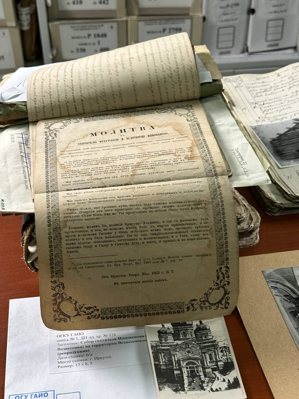 Также руководитель архива сопроводил главу митрополии в архивное хранилище, где владыке показали настоящие архивные сокровища: собственноручную подпись святителя Иннокентия (Кульчицкого), первого епископа Иркутской и молитву, которую передал святитель иркутянке Пелагее Ивановой. Эта молитва стала основой молитвы, которую читают свт. Иннокентию с сегодня.
