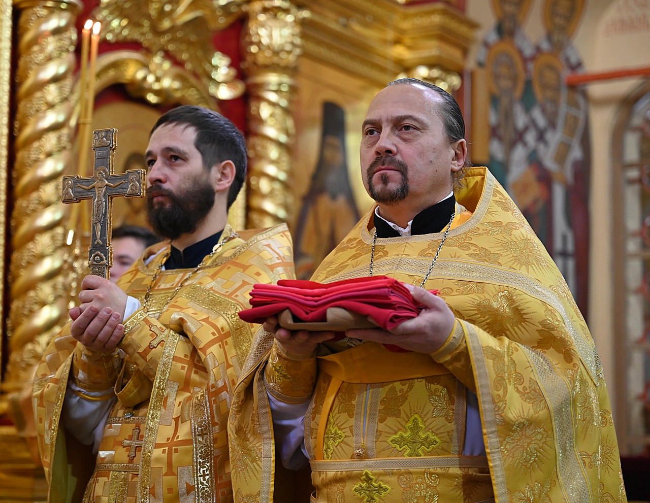 Правящему архиерею сослужили клирики собора и священники Братской епархии, проходящие в Иркутске курсы повышения квалификации: протоиерей Петр Борновалов (настоятель храма в честь Иверской иконы Божией Матери с.Покосное); священник Димитрий Ратушнюк (настоятель Успенского храма ж.р.Падун г.Братска) и священник Михаил Тарасов (настоятель Ильинского храма пос.Прибрежный).