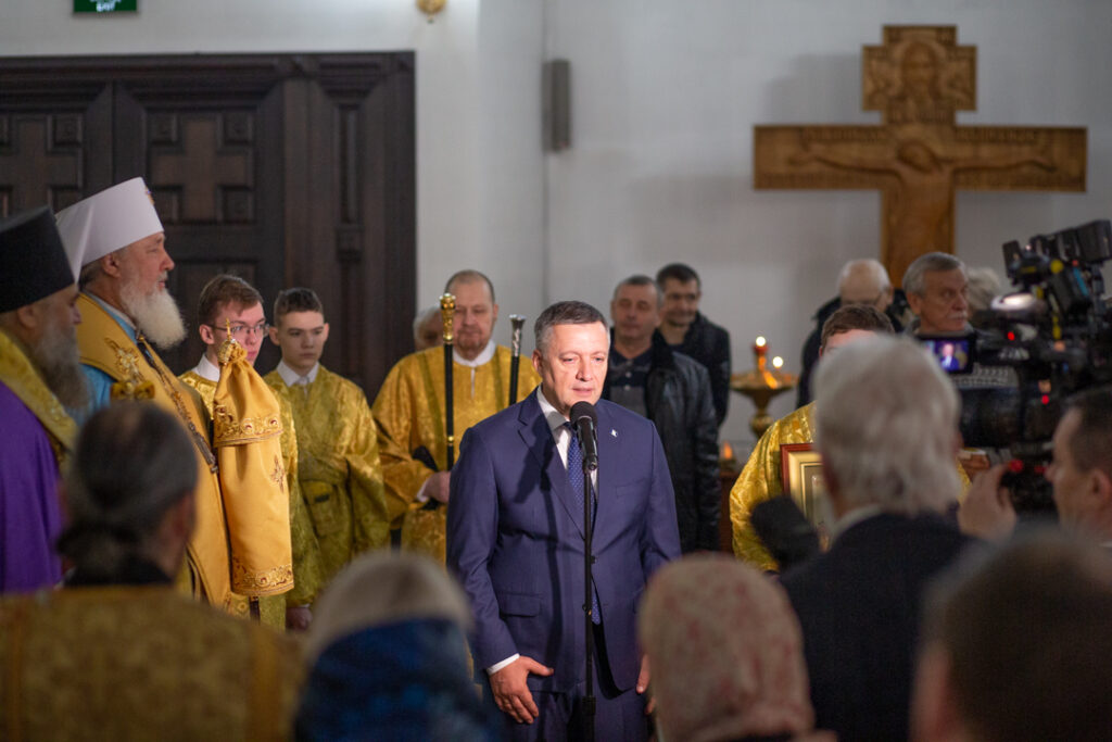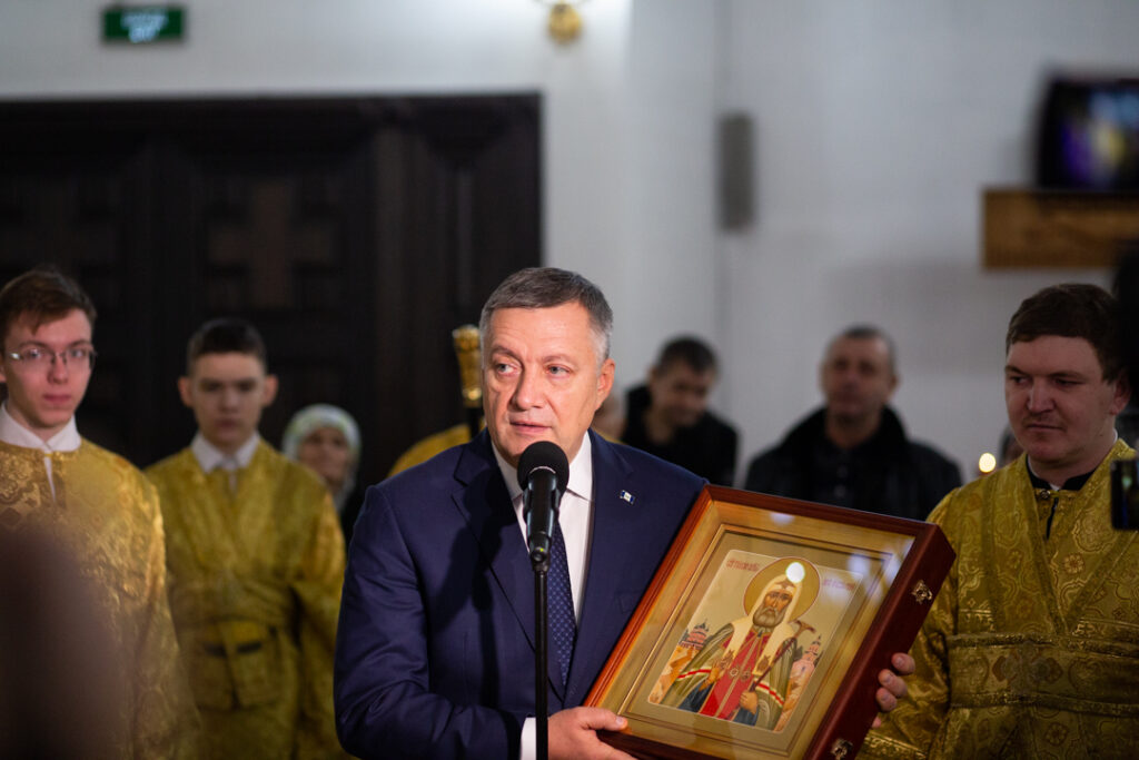 Далее губернатор Иркутской области Игорь Иванович Кобзев поздравил жителей Братска с днём основание города и подчеркнул: «70 лет назад тысячи энтузиастов приехали строить своё будущее, и с тех пор Братск стал крупным промышленным и жилым центром». Губернатор отметил трудолюбие, честность и открытость братчан, а также их готовность защищать Родину. Он пожелал горожанам мужества, терпения и оптимизма в преодолении трудностей. Игорь Иванович выразил благодарность первостроителям и всем, кто продолжает развивать город. В знак уважения и благодарности губернатор преподнёс собору икону святителя Тихона, назвав его примером стойкости в сложные времена.