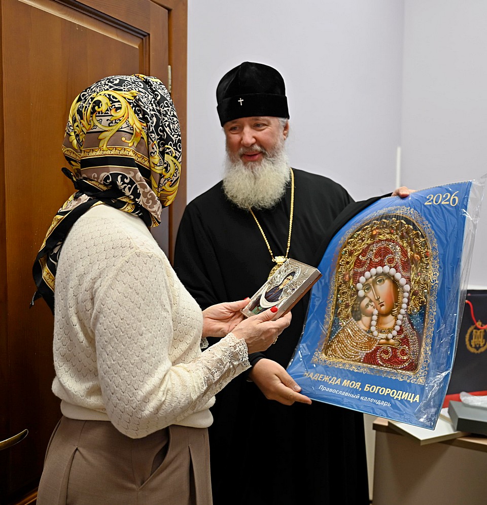 Владыка преподнес в подарок Ирине Владимировне икону Покрова Пресвятой Богородицы и православный календарь на будущий год.