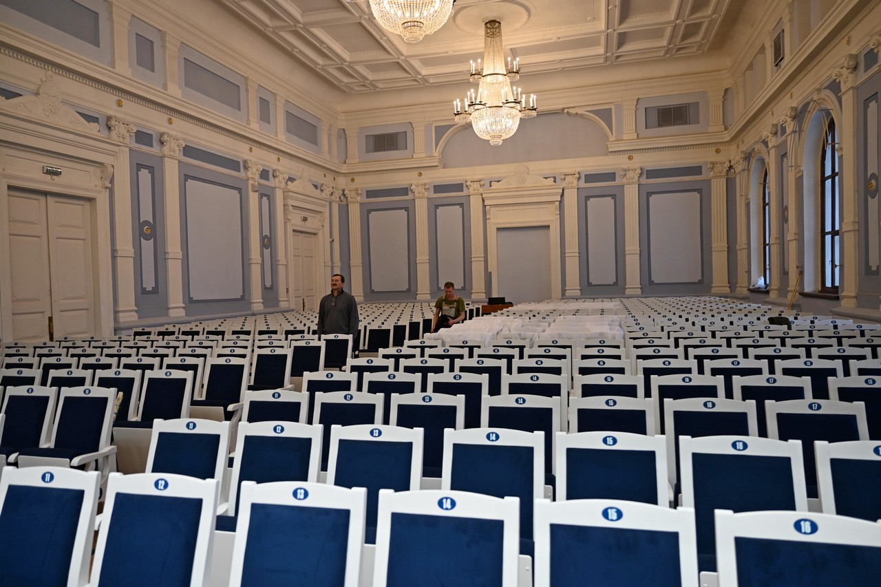 Много было сделано и внутри здания: заменили электрические сети и коммуникации, в зрительном зале обновили сцену, полы, потолки, установили новые удобные кресла. Ведется отделка помещений и модернизация гардеробной.