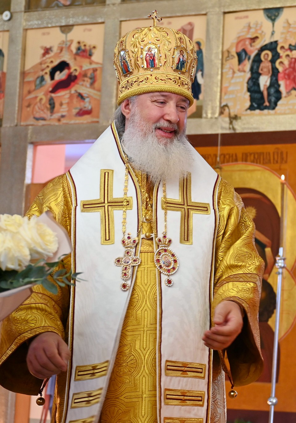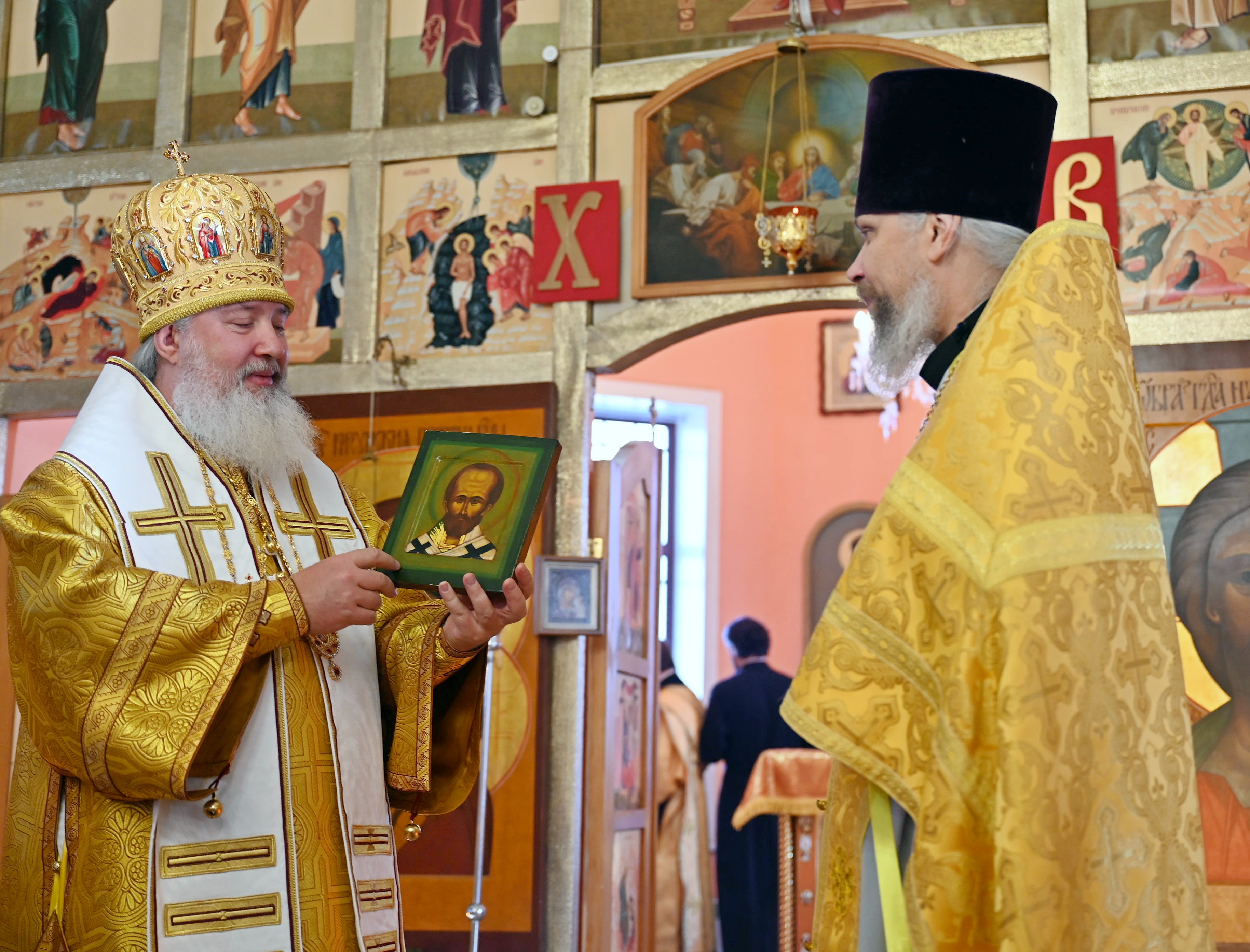 Отец Олег сердечно поблагодарил владыку за радость архиерейского богослужения на приходе, и преподнес главе митрополии икону свт.Николая и букет белых роз.