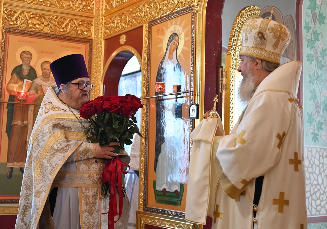 Благочинный протоиерей Вячеслав Пушкарев также поблагодарил владыку за внимание, пожелал ему доброго здравия, испросив прощения за всё прегрешения, вольные и невольные, и преподнес правящему архиерею букет из 29 алых роз - по числу лет, в продолжении которых живет Свято-Троицкий храм с.Хомутово.