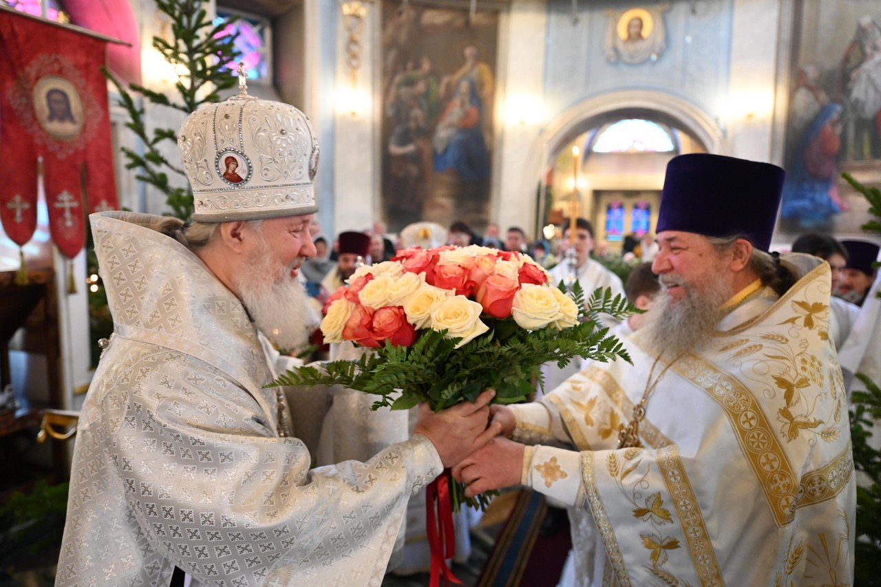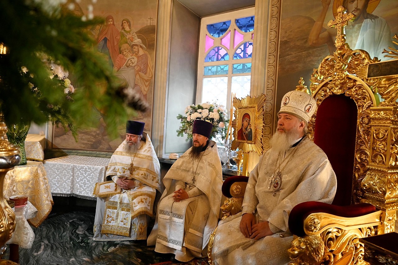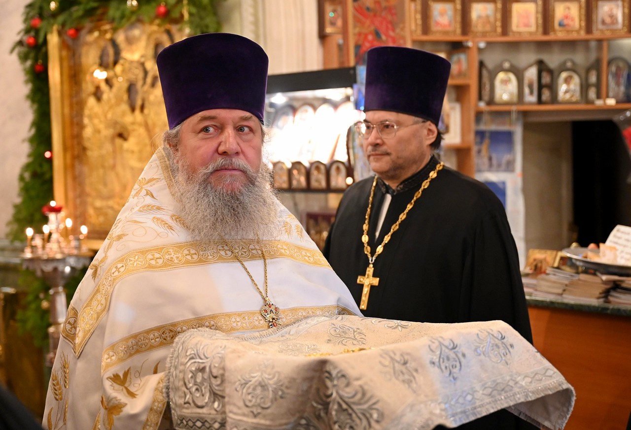 Настоятель храма протоиерей Сергий сердечно поблагодарил правящего архиерея за радость Литургии архиерейским служением и поздравил его с мироспасительным праздником Христова Рождества.