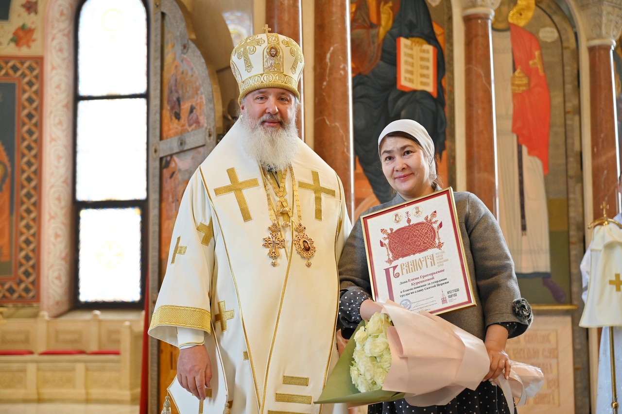 В честь юбилея, который матушка отмечает сегодня, владыка вручил матушке Елене Благословенную грамоту за её неустанные многолетние труды во благо Святой Церкви.