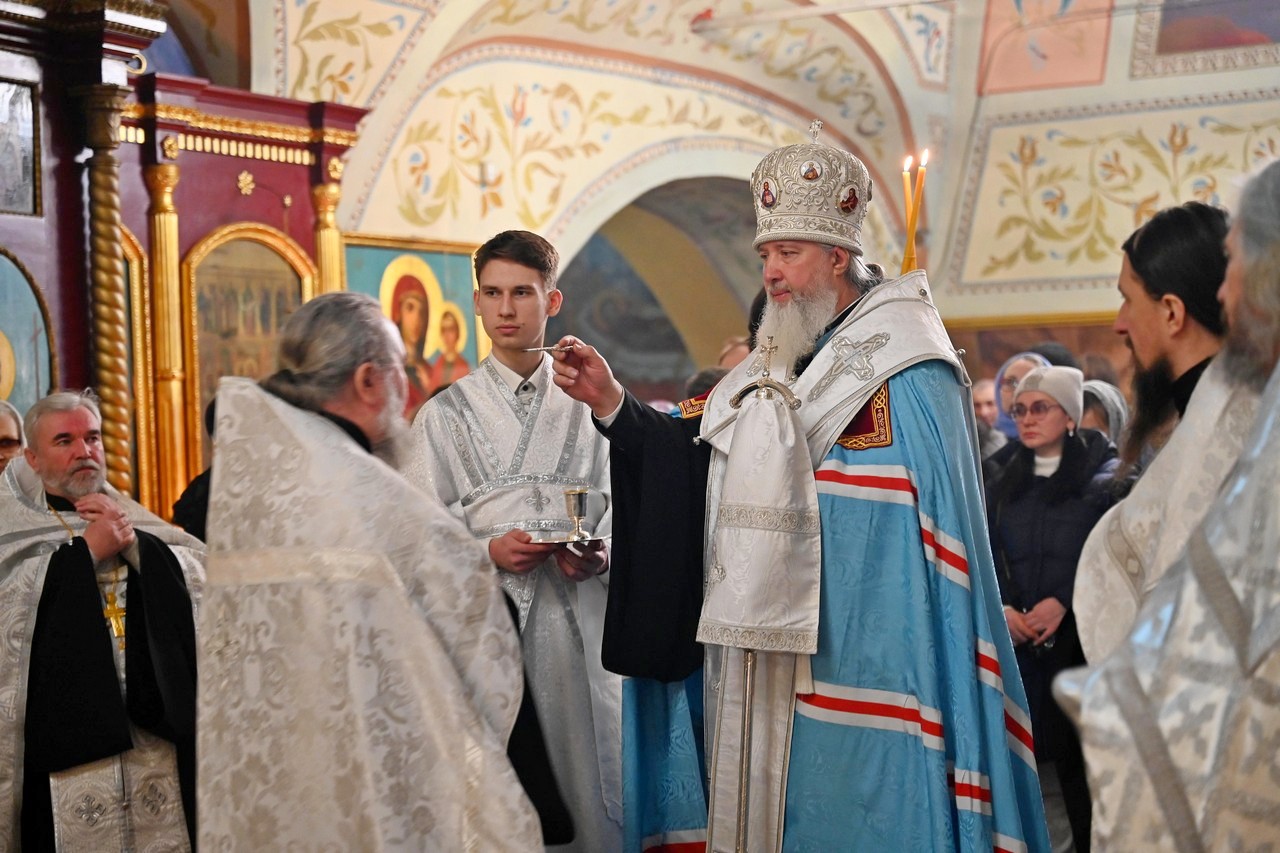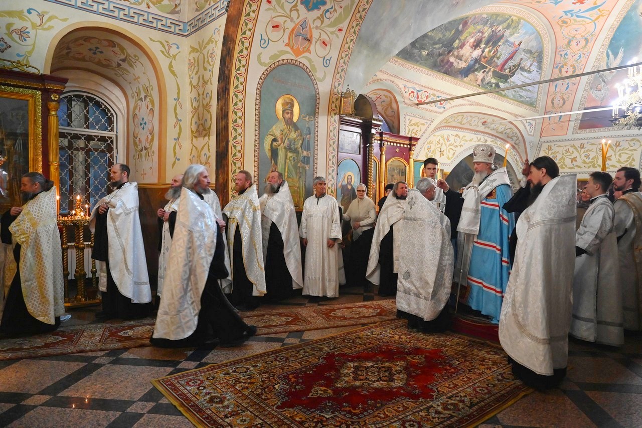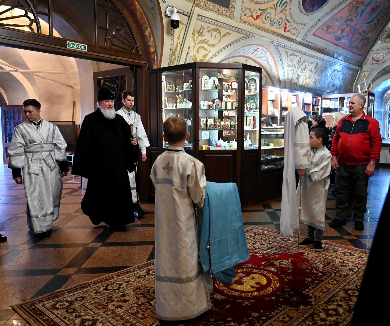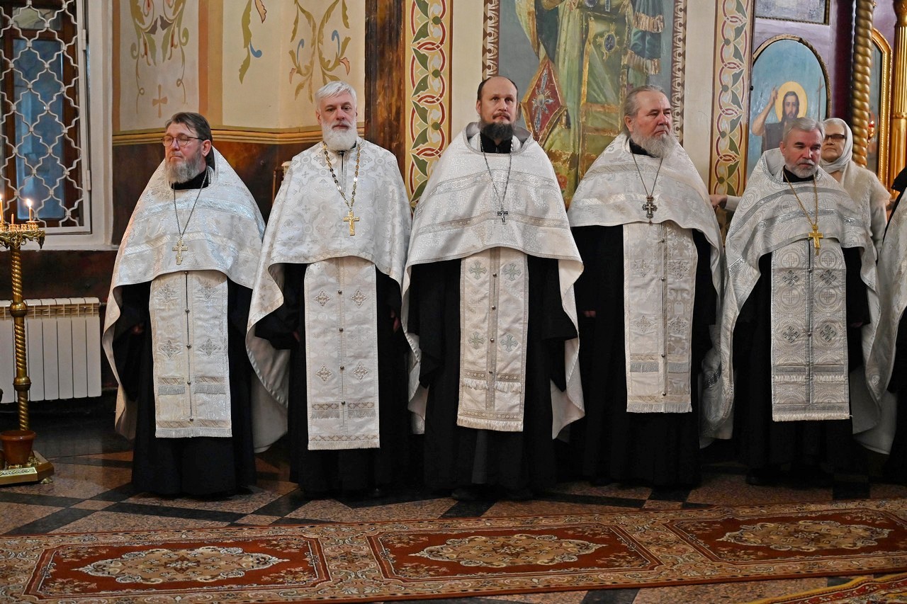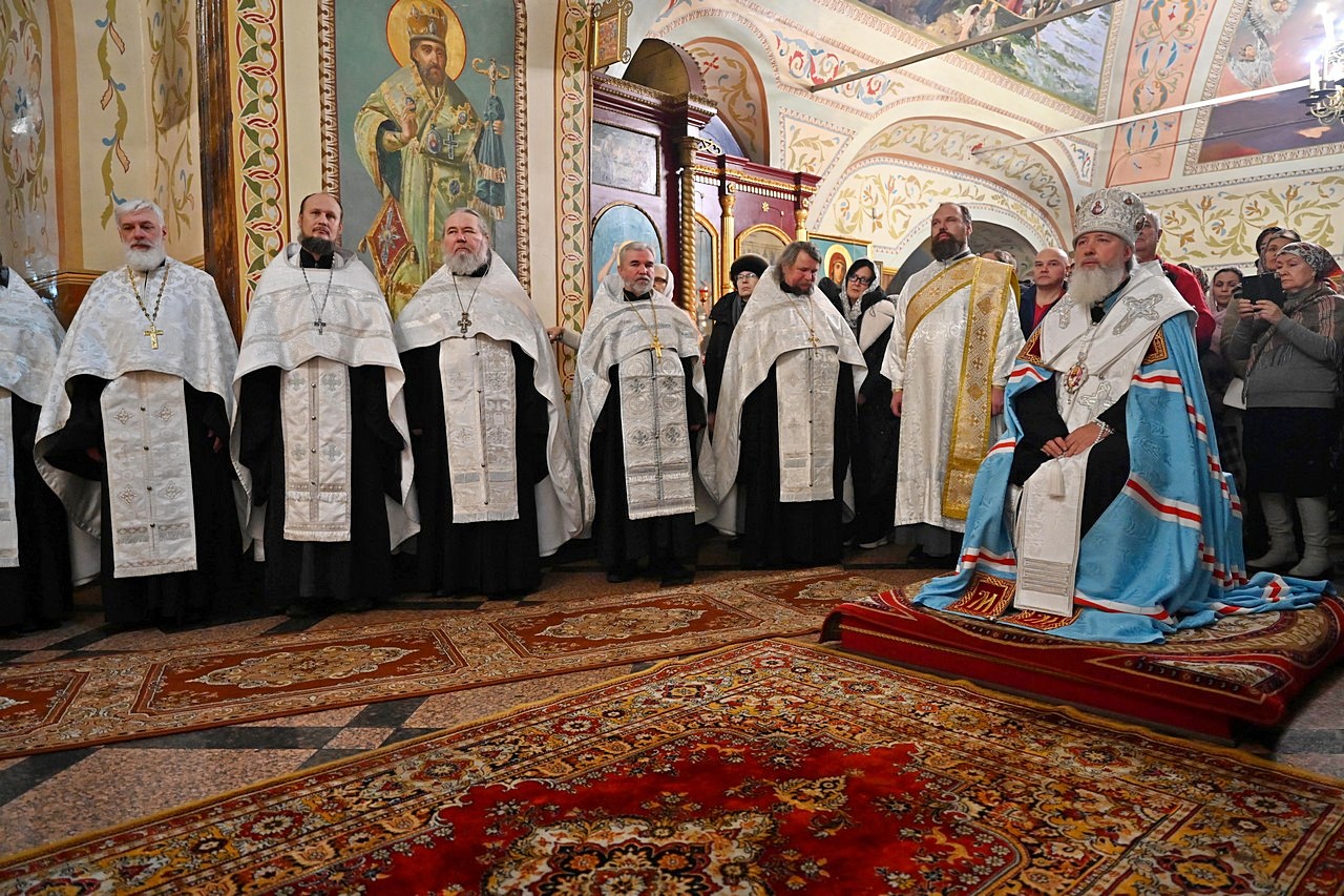 Его Высокопреосвященству сослужили ключарь собора игумен Феофан (Евтихеев), секретарь Иркутской епархии священник Стефан Бажков, благочинный I-го Иркутского церковного районного округа протоиерей Герман Кузнецов, духовенство благочиния и клирики Знаменского собора.