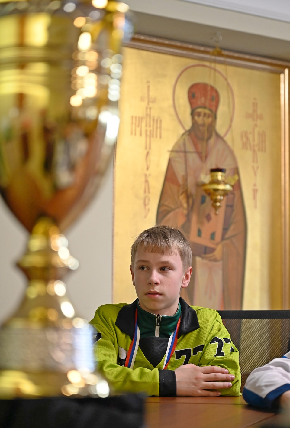 Владыка Максимилиан побеседовал с ребятами о святителе Иннокентии Иркутском - небесном покровителе Иркутского юношеского турнира по хоккею с мячом, заинтересованно расспросил их об игре в финале и о впечатлениях от поездки, ответил на вопросы ребят.