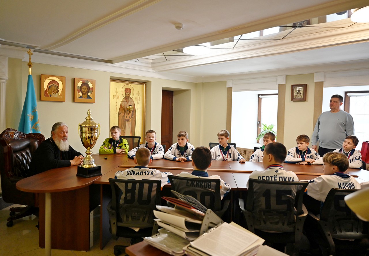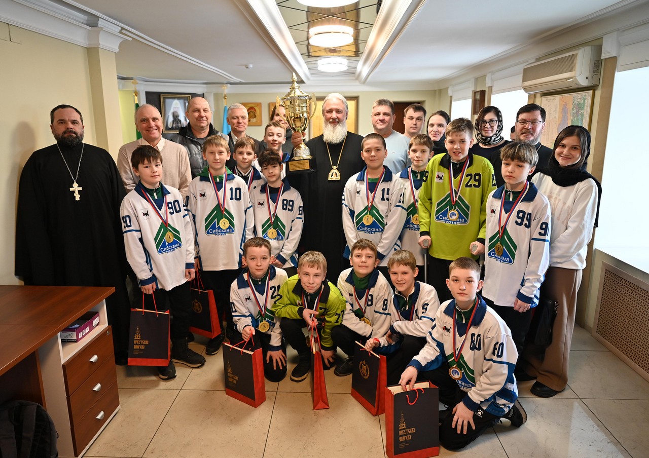 Победители прибыли в гости к правящему архиерею с выигранным кубком, в форме клуба. Их сопровождали заместитель директора ОГБУ «Спортивная школа по хоккею с мячом «Сибскана» Василий Карелин, тренеры Александр Межуев и Алексей Баженов, родители юных хоккеистов и их духовные наставники - священники Максим Гаськов и Виктор Черненко.