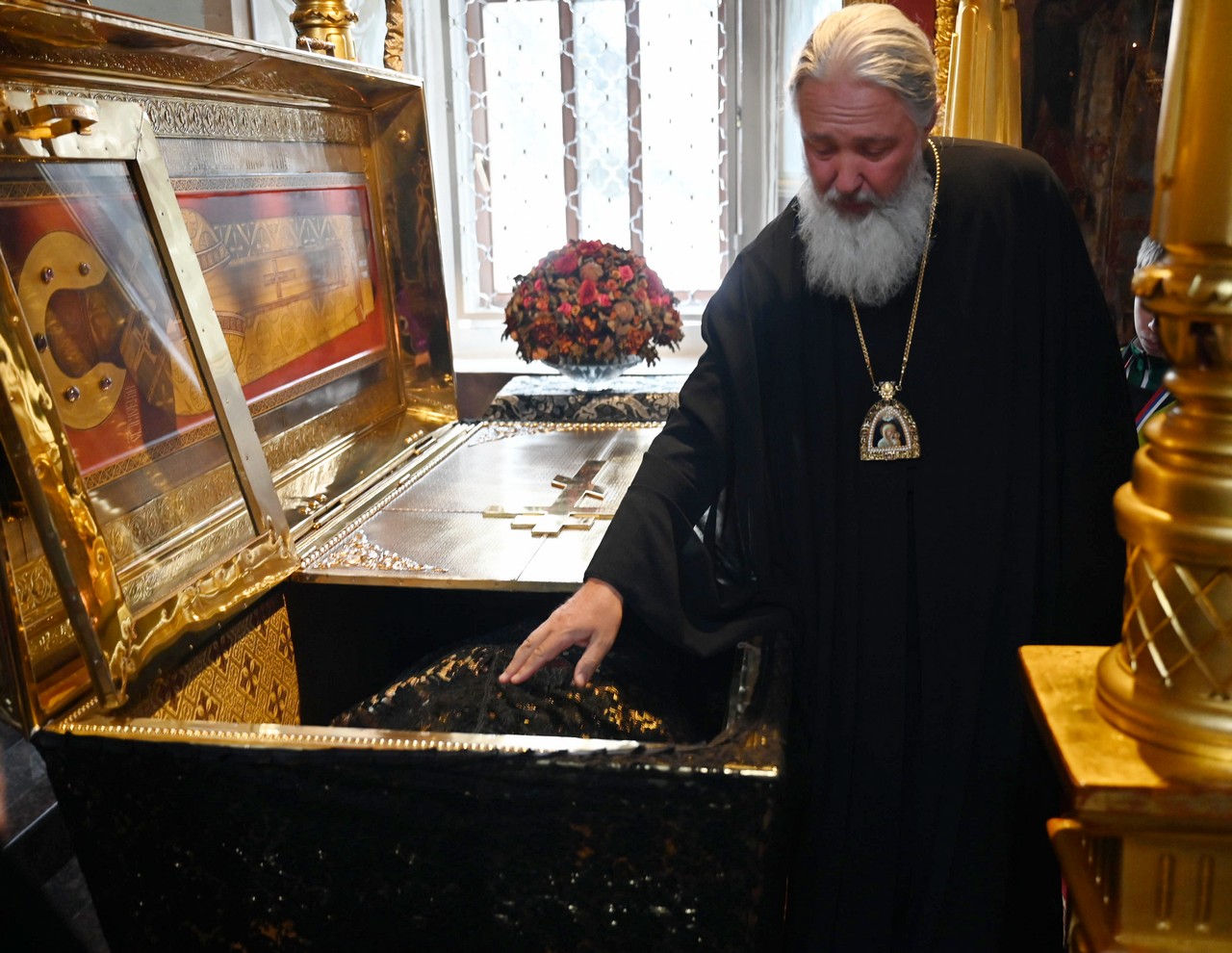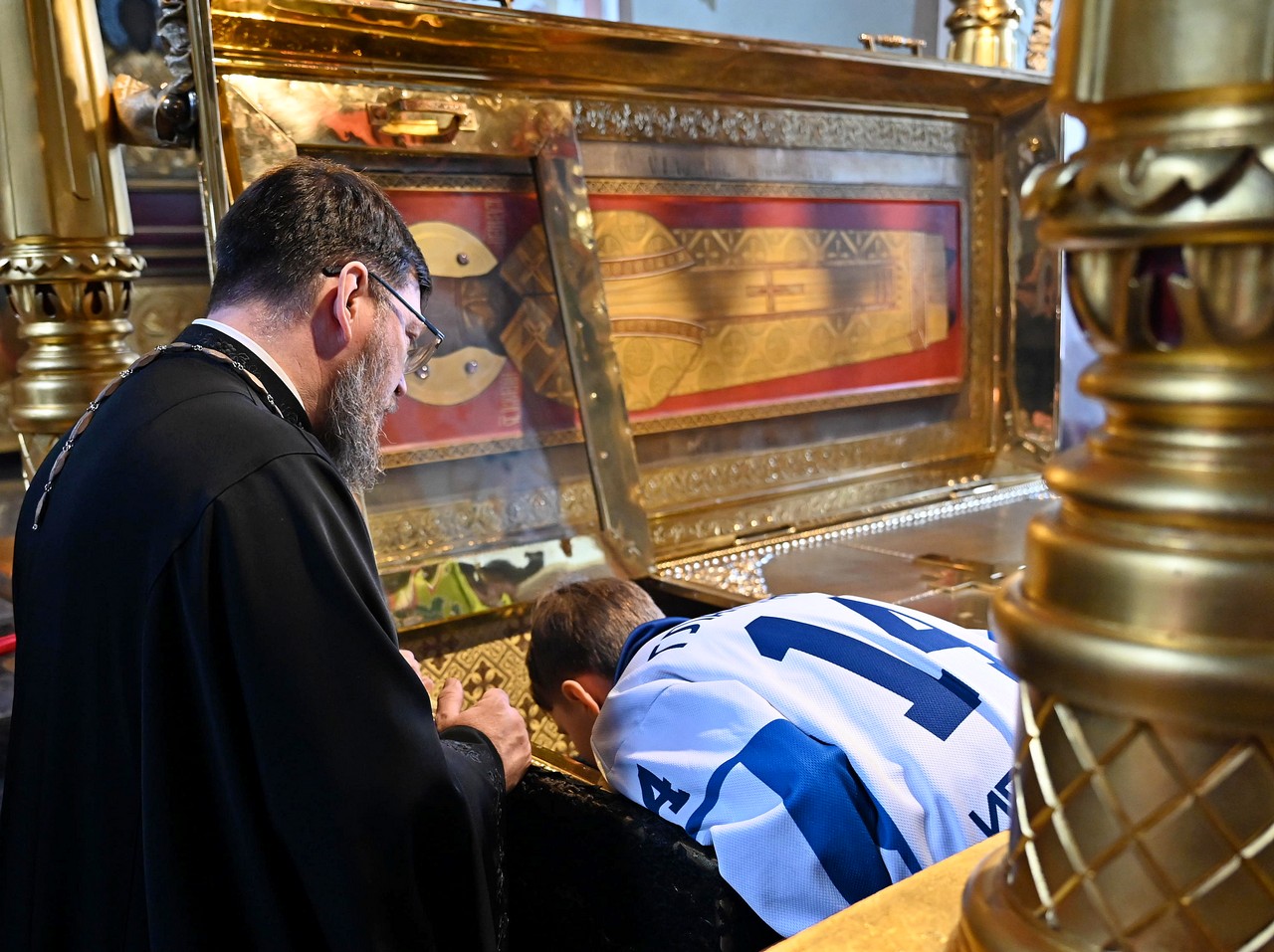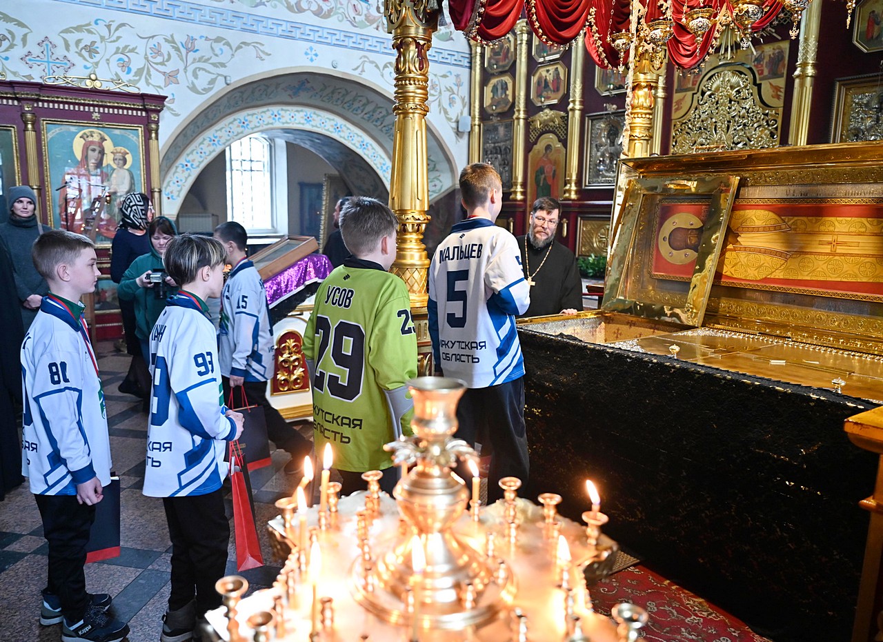 По завершении беседы правящий архиерей помолился вместе с ребятами святителю Иннокентию перед его иконой и святыми мощами в Знаменском соборе и преподнес в подарок каждому игроку книгу об устройстве храма и икону святителя Иннокентия Иркутского🧔♂, а также получил в подарок от команды медаль - точную копию медали, заслуженно полученной хоккеистами на Патриаршием турнире.