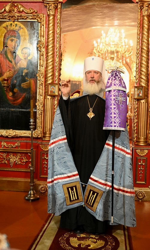 Владыка Максимилиан также обратился к прихожанам с назидательным словом, в котором сказал о том, что «Господь призывает нас взять крест свой и следовать за Ним – только так возможно нам найти спасение. Если мы сами не приложим усилия: усилие воли, усилие сердца, усилие ума к тому, чтобы спастись, спастись мы не сможем. Мы образ и подобие Божие и должны выбирать все сознательно, свободной волей», для чего должны быть готовы «потерять душу свою» - то есть «потерять расположение ко всему, что прельщает нас в жизни, а взамен возлюбить Господа». «Это возможно в обратном порядке: сначала нужно возлюбить Господа всем существом своим, а потом все остальное в свете этой любви должно померкнуть перед нашими глазами» - «так мы потеряем, но спасем душу свою». Владыка пояснил, что тогда «мы должны быть уверены, что Господь, при нашем желании и усилии, поможет там и проведет по волнам бурного житейского моря» и что «в жизни мы должны служить либо Богу – либо маммоне».