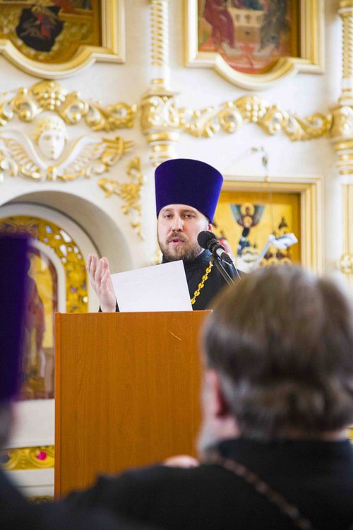Во второй части собрания выступил руководитель епархиального отдела религиозного образования и катехизации иерей Иоанн Афонин и рассказал о деятельности отдела, взаимодействии священников со школами, напомнил о конкурсах для учеников и преподавателей, проводимых Русской Православной Церковью, и о курсах повышения квалификации педагогов ОРКиСЭ.