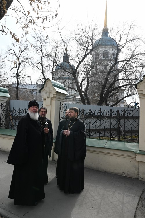 По окончании богослужения правящий архиерей вместе с настоятелем и духовенством осмотрели территорию реставрируемого Свято-Троицкого храма.