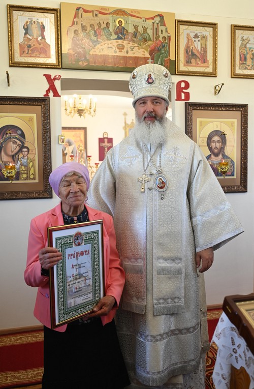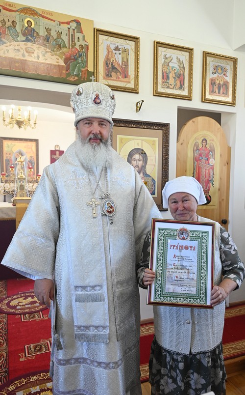 В завершение богослужения митрополит Максимилиан вручил архиерейские грамоты тем, кто особенно потрудился во Славу Божию и на благо прихода: Просекиной Наталье Петровне, старосте храма, и Сыроватской Анне Петровне.