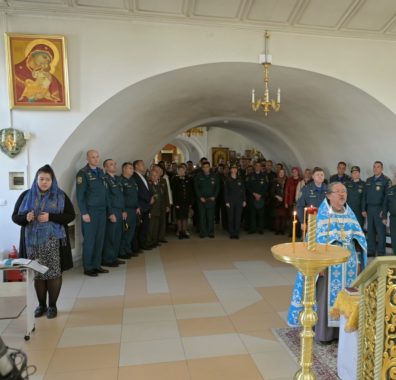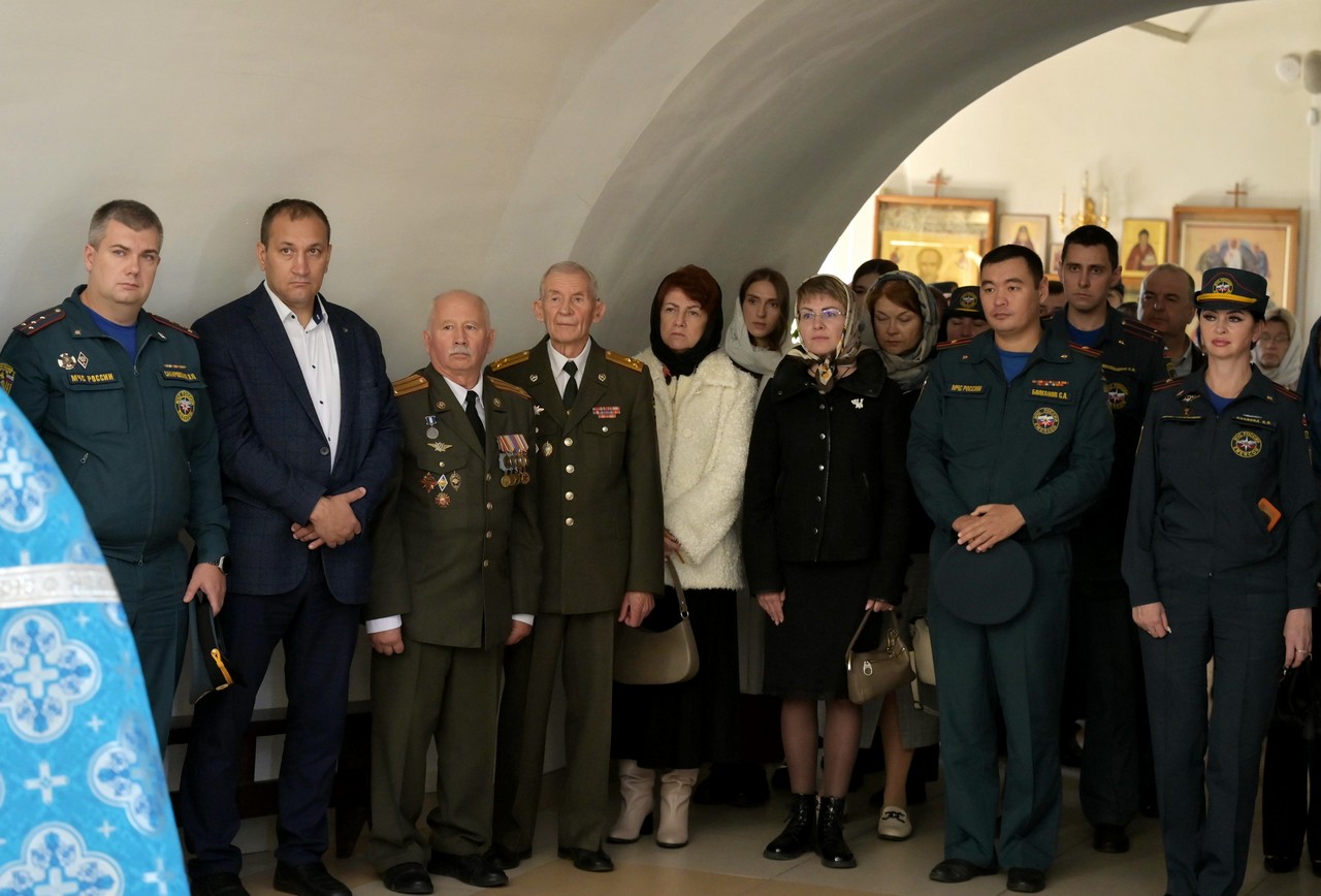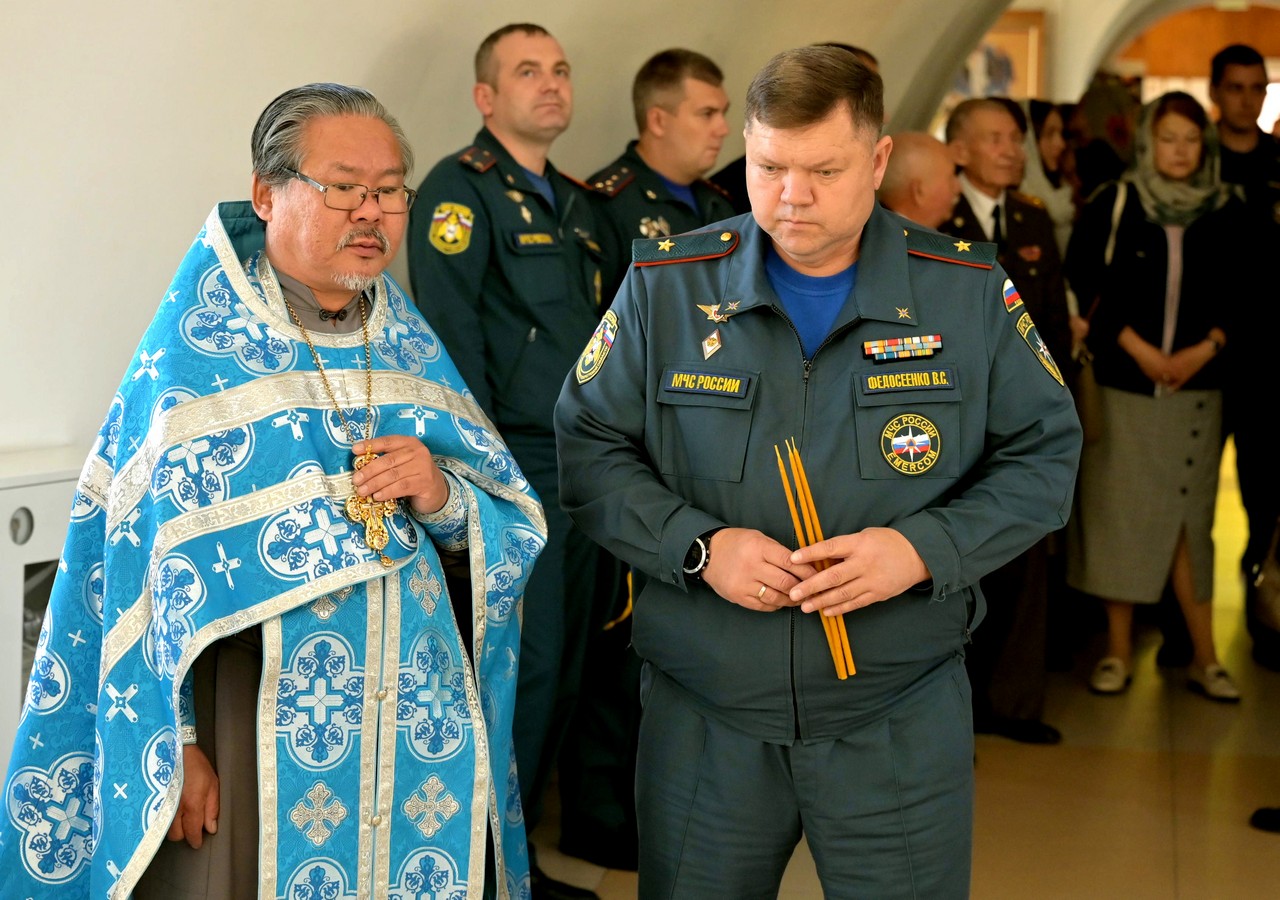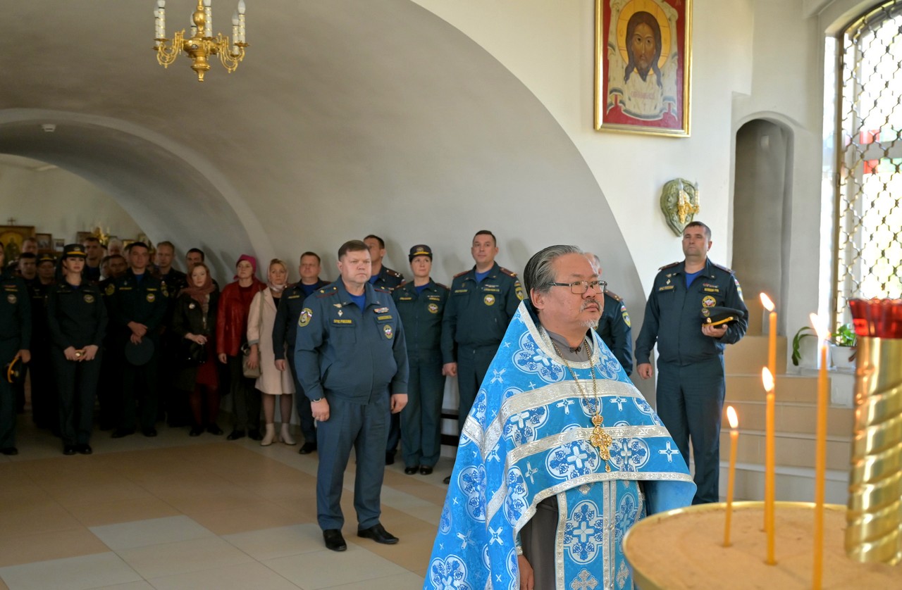 На молебне присутствовали начальник ГУ МЧС России по Иркутской области генерал-майор внутренней службы Вячеслав Сергеевич Федосеенко, его заместитель по государственной противопожарной службе, начальник управления организации пожаротушения и проведения спасательных работ, полковник внутренней службы Роман Юрьевич Пешков, сотрудники ведомства и ветераны пожарной охраны.