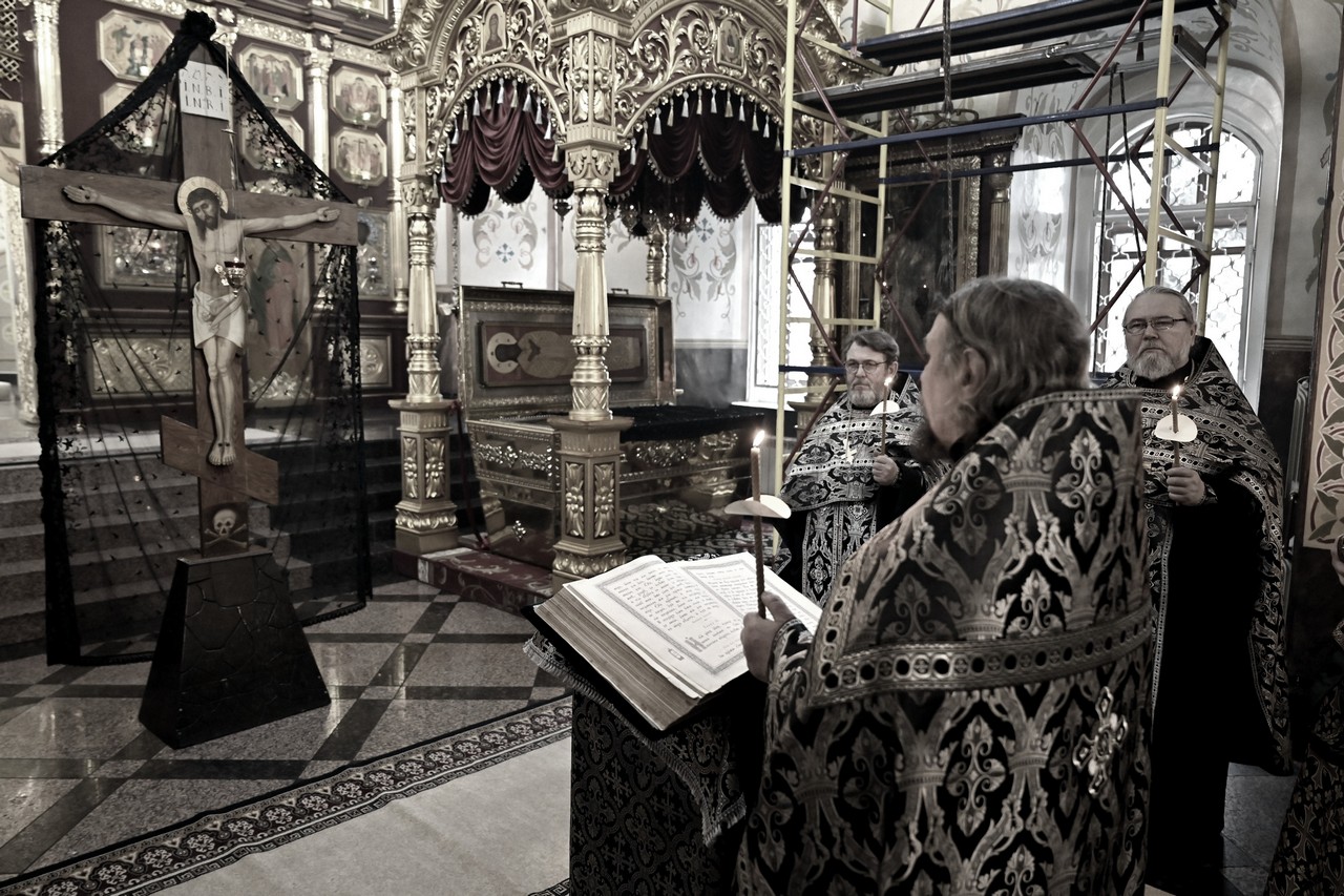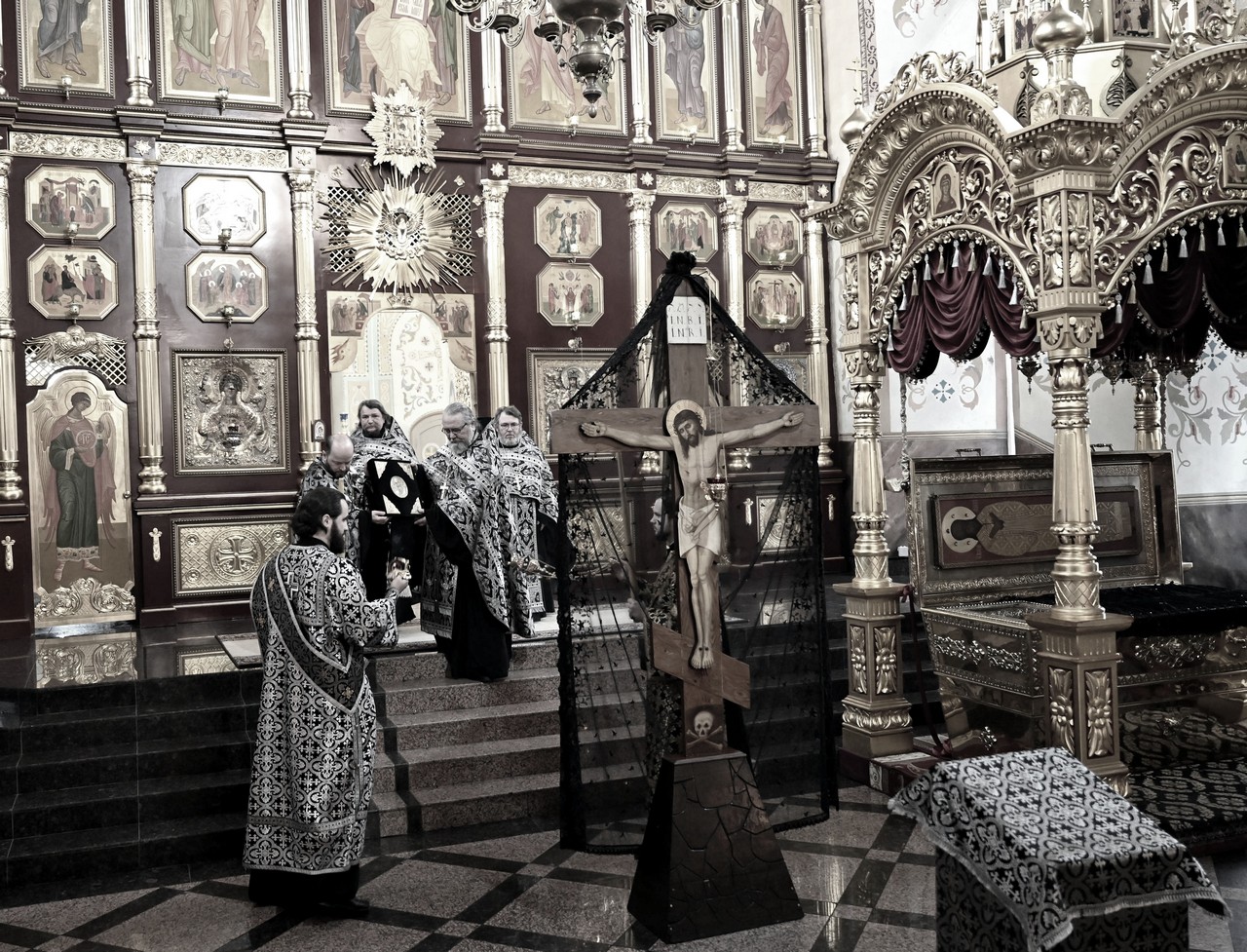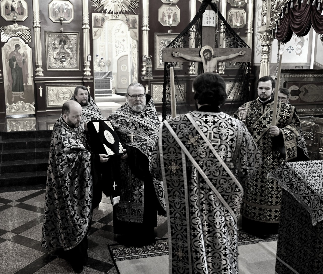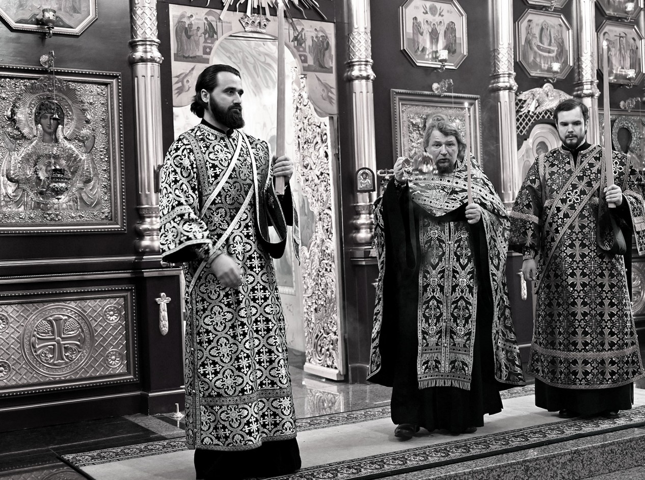 Акафист Страстям Христовым (Последнюю, 4-ю Пассию этого Великого поста) 30 марта 2025 года совершили в Знаменском соборе клирики храма: игумен Феофан (Евтихеев), иеромонах Ефрем (Пашков), священник Димитрий Давыдов, диаконы Прохор Огородников и Владимир Соколов.