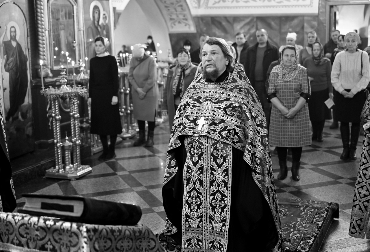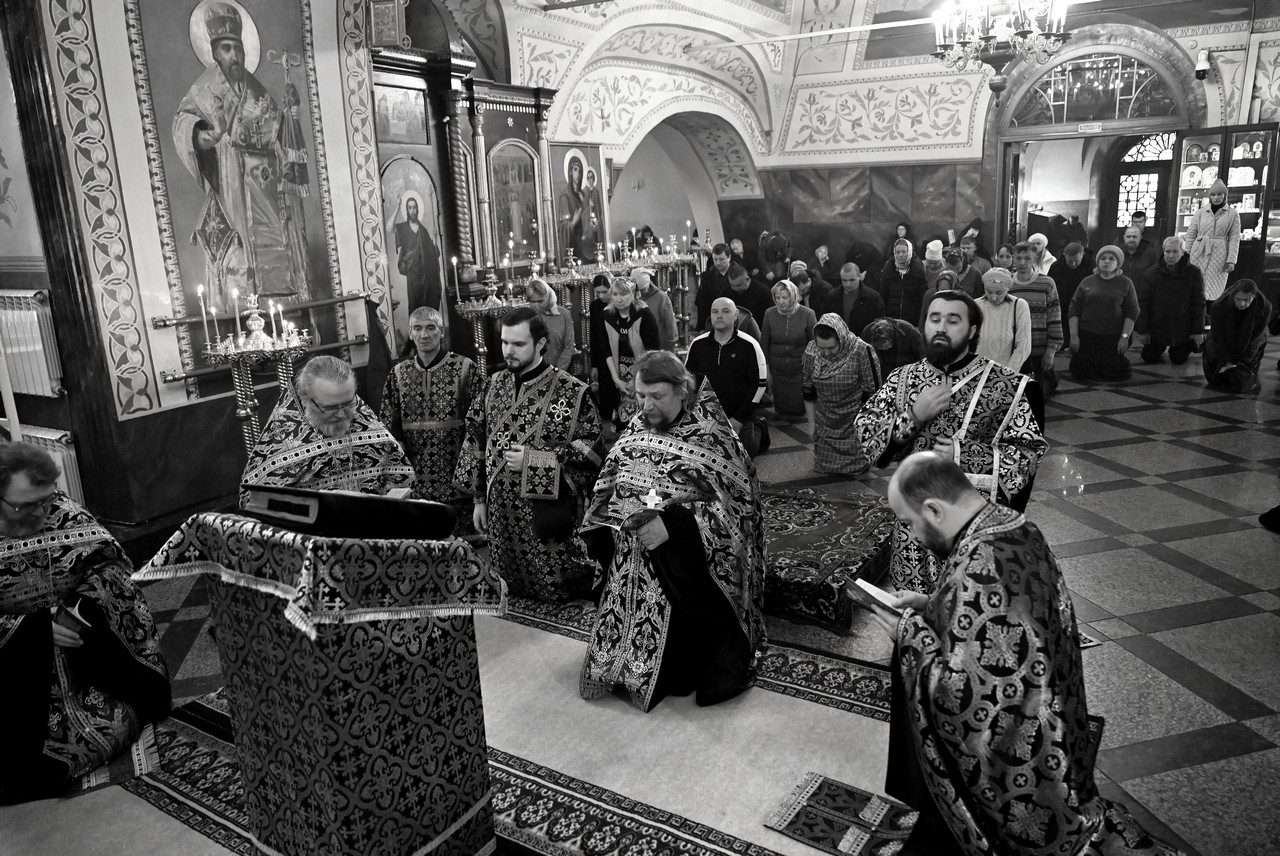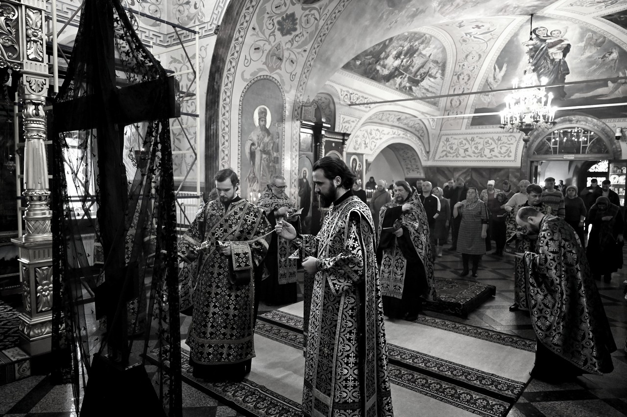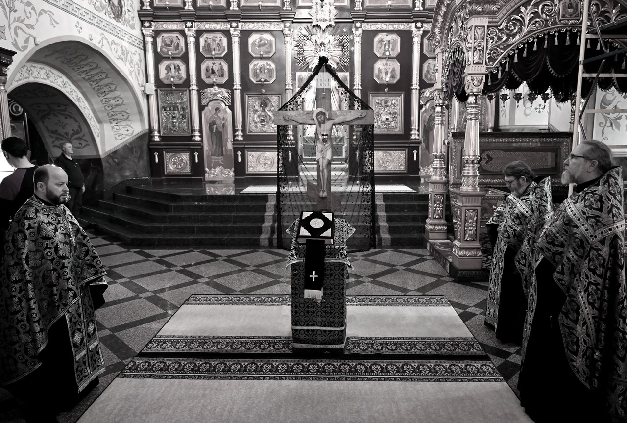 Акафист Страстям Христовым (Последнюю, 4-ю Пассию этого Великого поста) 30 марта 2025 года совершили в Знаменском соборе клирики храма: игумен Феофан (Евтихеев), иеромонах Ефрем (Пашков), священник Димитрий Давыдов, диаконы Прохор Огородников и Владимир Соколов.