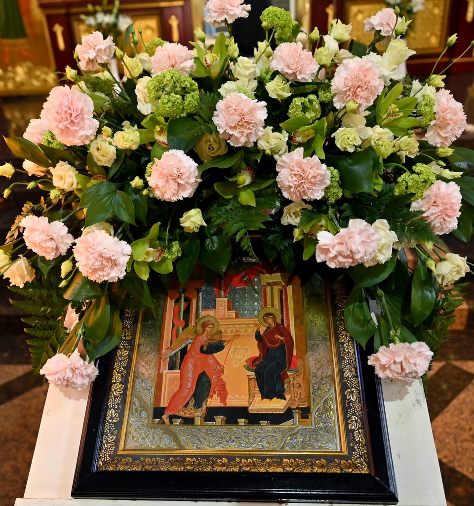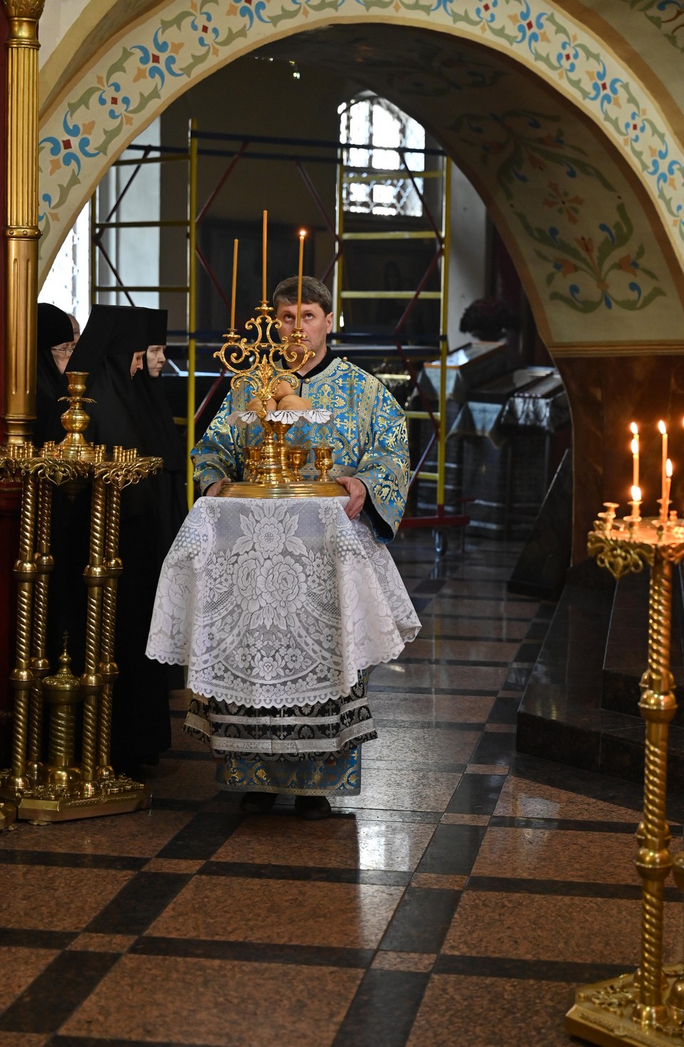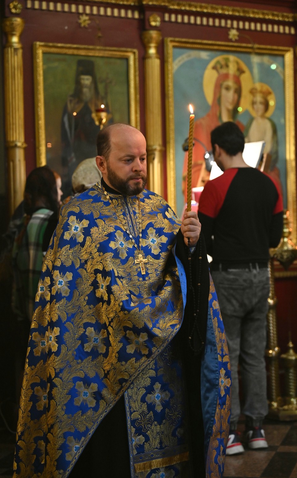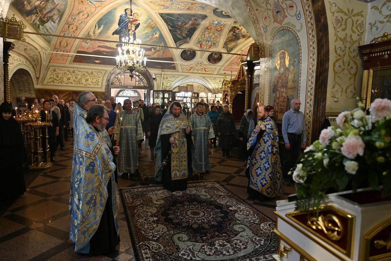 Всенощное бдение в канун праздника Благовещения Пресвятой Богородицы 6 апреля 2025 года в Знаменском монастыре соборно совершили клирики Знаменского собора.