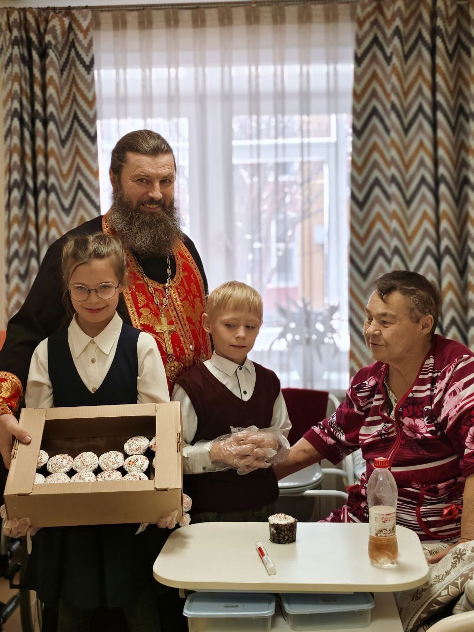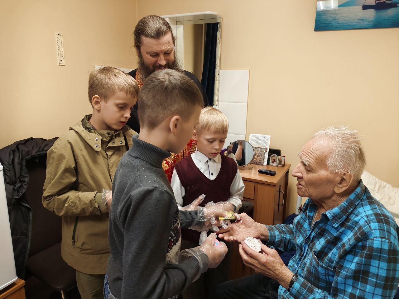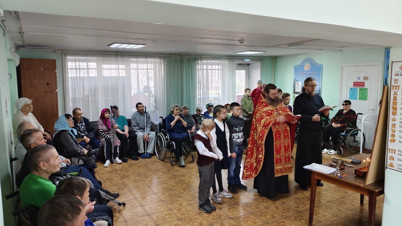 Отец Алексий совершил в интернате праздничный пасхальный молебен. В этом духовном событии ему помогали юные помощники из церковно-приходской школы. Ребятишки, вместе с батюшкой исполняли пасхальные песнопения, читали молитвы и угощали куличами. После молебна отец Алексий и помощники отправились по комнатам дома-интерната, где продолжили делиться радостной пасхальной вестью с маломобильными проживающими.