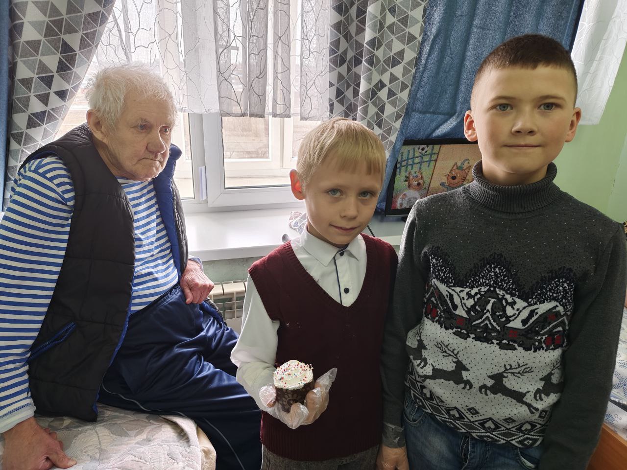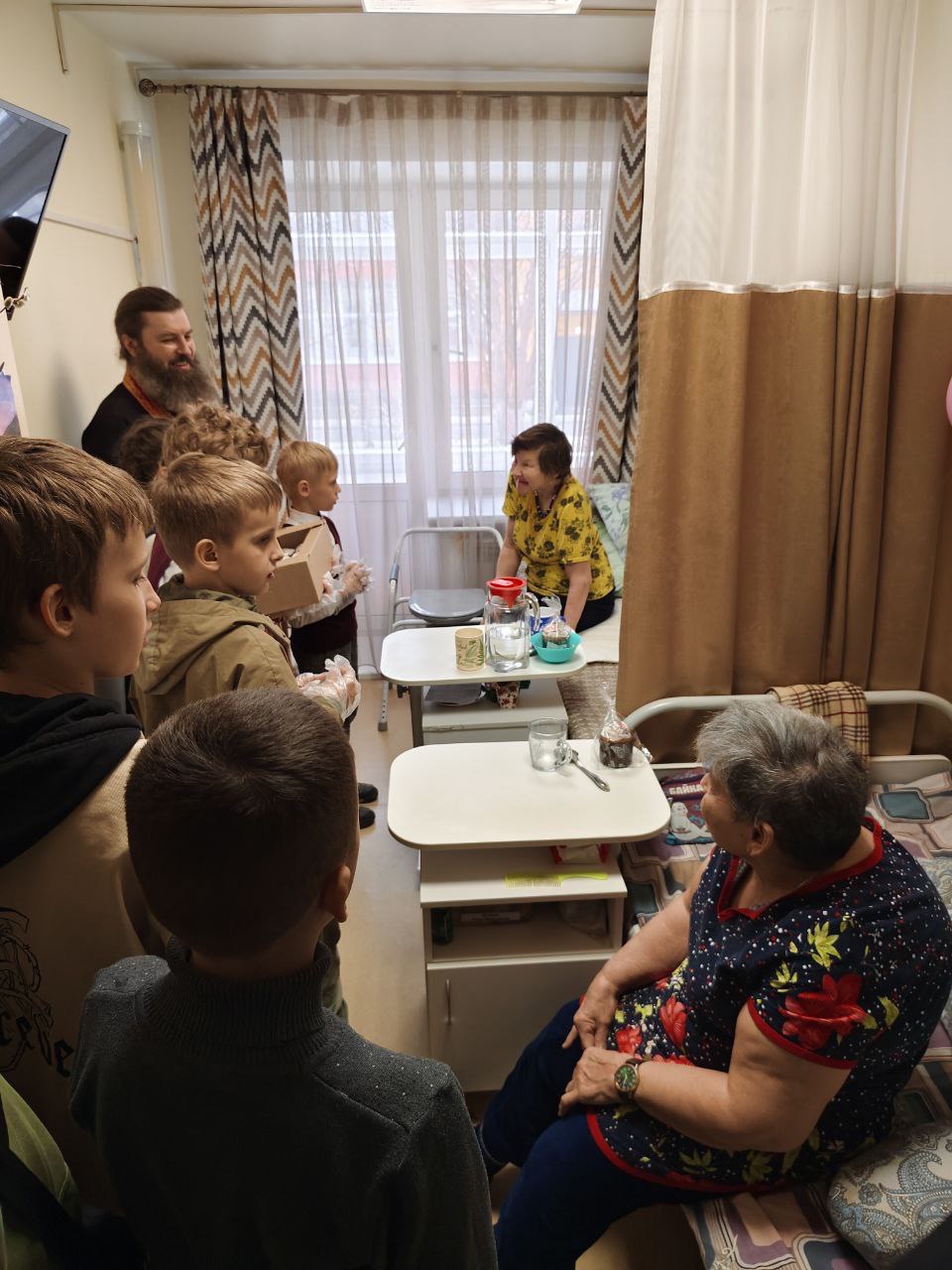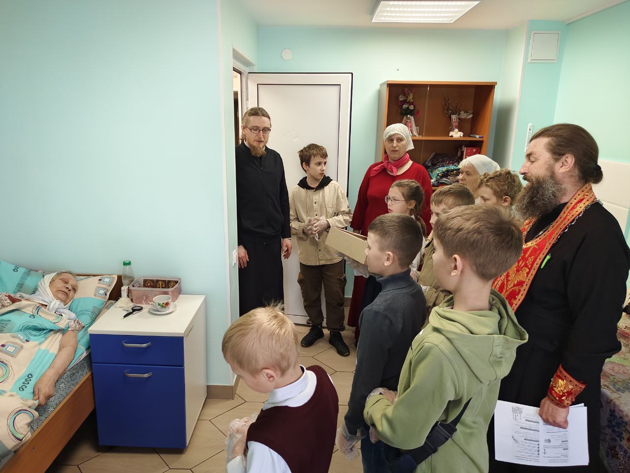 Отец Алексий совершил в интернате праздничный пасхальный молебен. В этом духовном событии ему помогали юные помощники из церковно-приходской школы. Ребятишки, вместе с батюшкой исполняли пасхальные песнопения, читали молитвы и угощали куличами. После молебна отец Алексий и помощники отправились по комнатам дома-интерната, где продолжили делиться радостной пасхальной вестью с маломобильными проживающими.