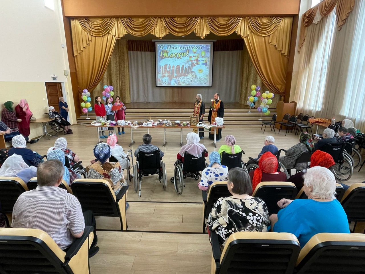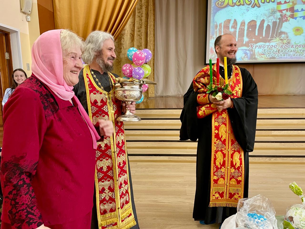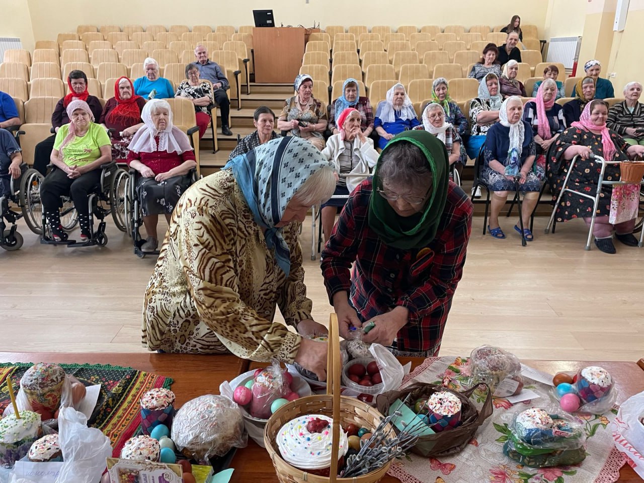 Также в пасхальные дни священники посетили Марковский геронтологических центр, где совместно с клиросом исполнили пасхальные песнопения и освятили куличи, яйца и пасху.