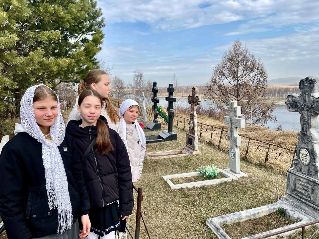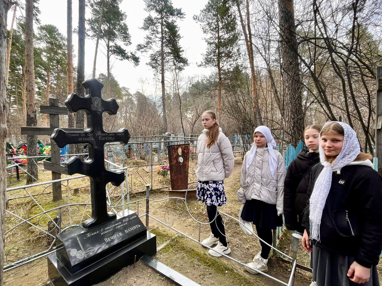 Вместе с преподавателями они пришли на местный погост, где похоронены игумен Евгений (Красноперов), диакон Иоанн с матушкой Татианой, монахини и прихожане храма.
