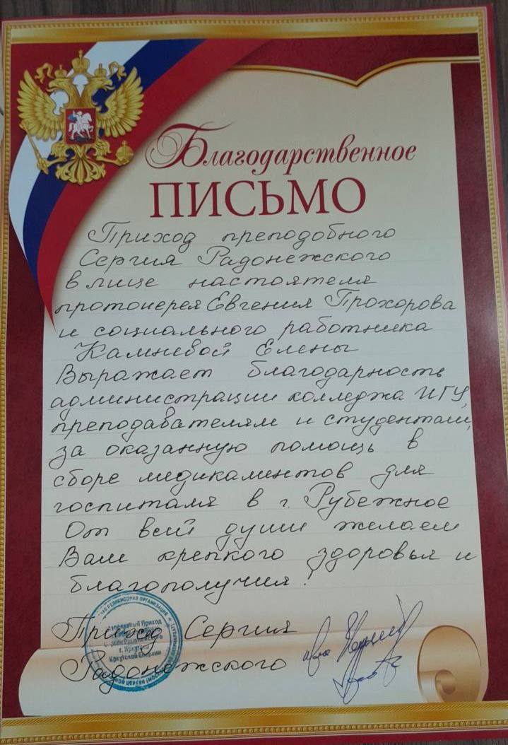 Приход поддерживает тесную связь с Иркутской клинической психиатрической больницей, помогая в закупке необходимых расходных материалов для ухода за пациентами.