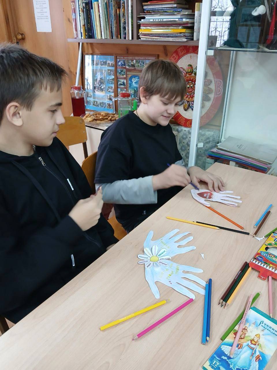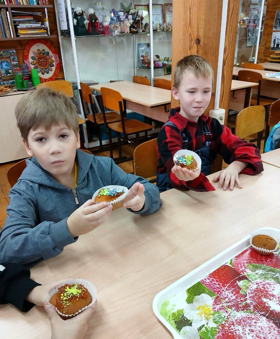 В конце занятия ребята своими руками изготовили поздравительные открытки и украсили кексы, которые заранее испекла повар трапезной Светлана Викторовна.