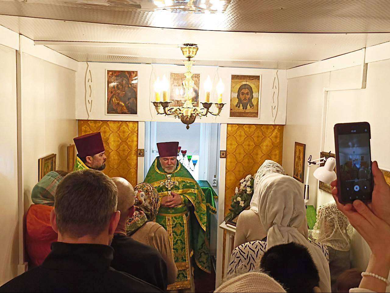 Пока богослужения совершаются в небольшом вагончике, где обустроен алтарь и есть немного места для молящихся.