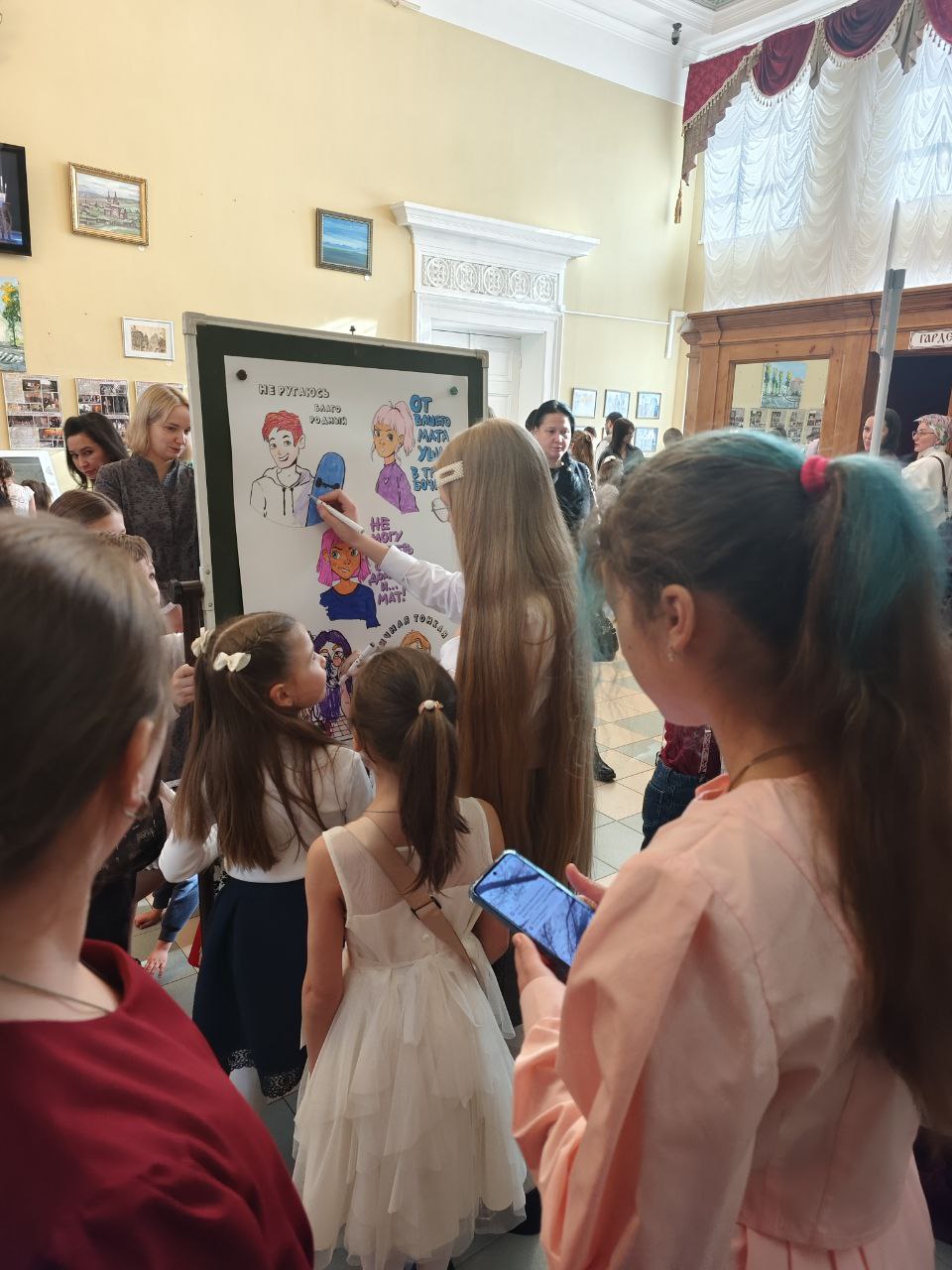 Перед началом утренника в фойе театра всем раздавались значки с логотипом проекта «Иркутск ЧистоРечный», реализуемого при поддержке Фонда президентских грантов, а также была устроена локация этого проекта, где все могли поучаствовать в раскрашивании макси-раскраски с проитивоскверными рисунками и слоганами, ведь в рамках этого утренника проводился и фестиваль проекта «Иркутск ЧистоРечный».